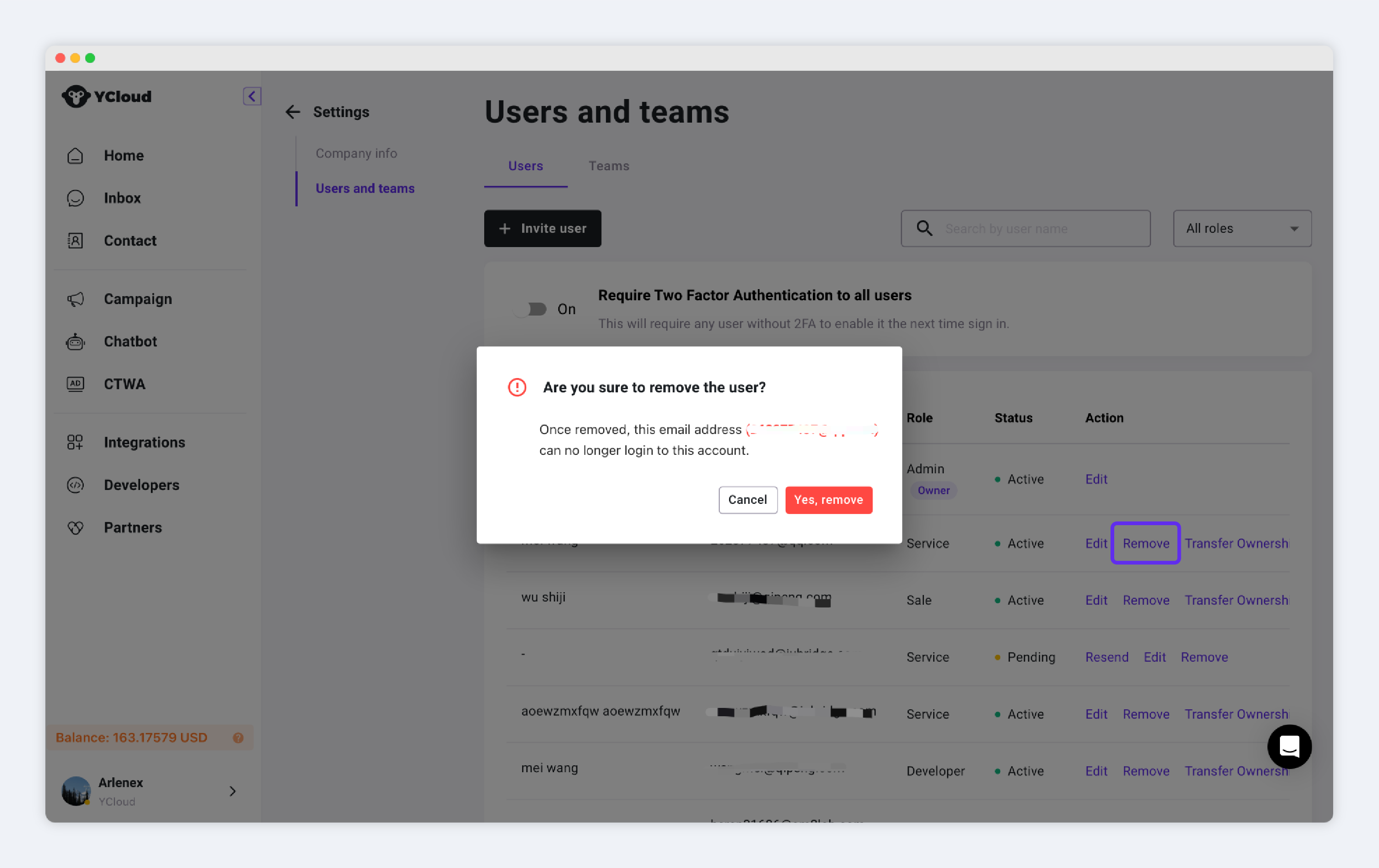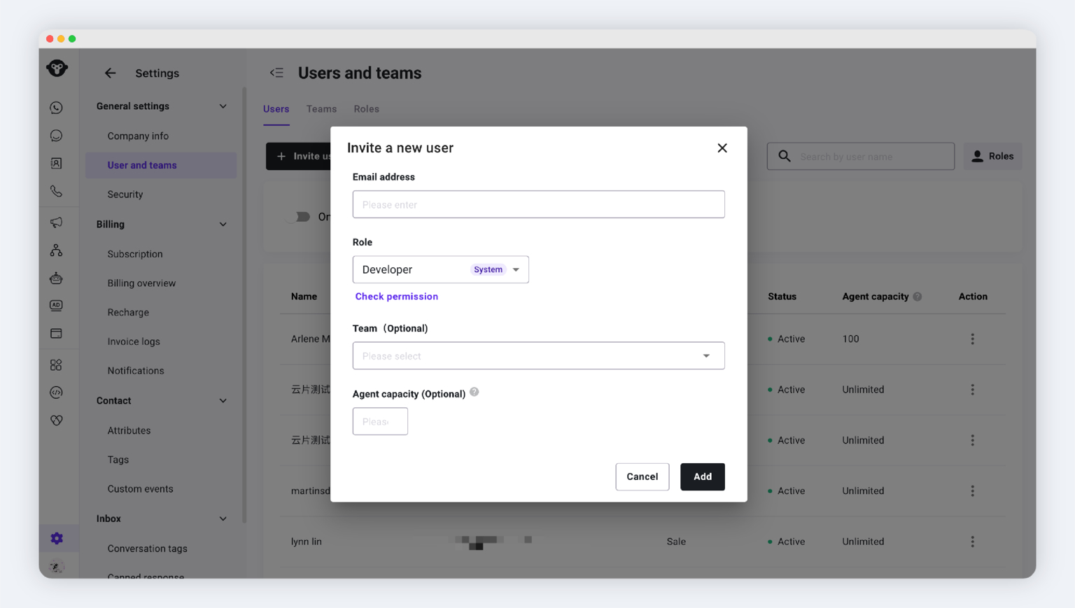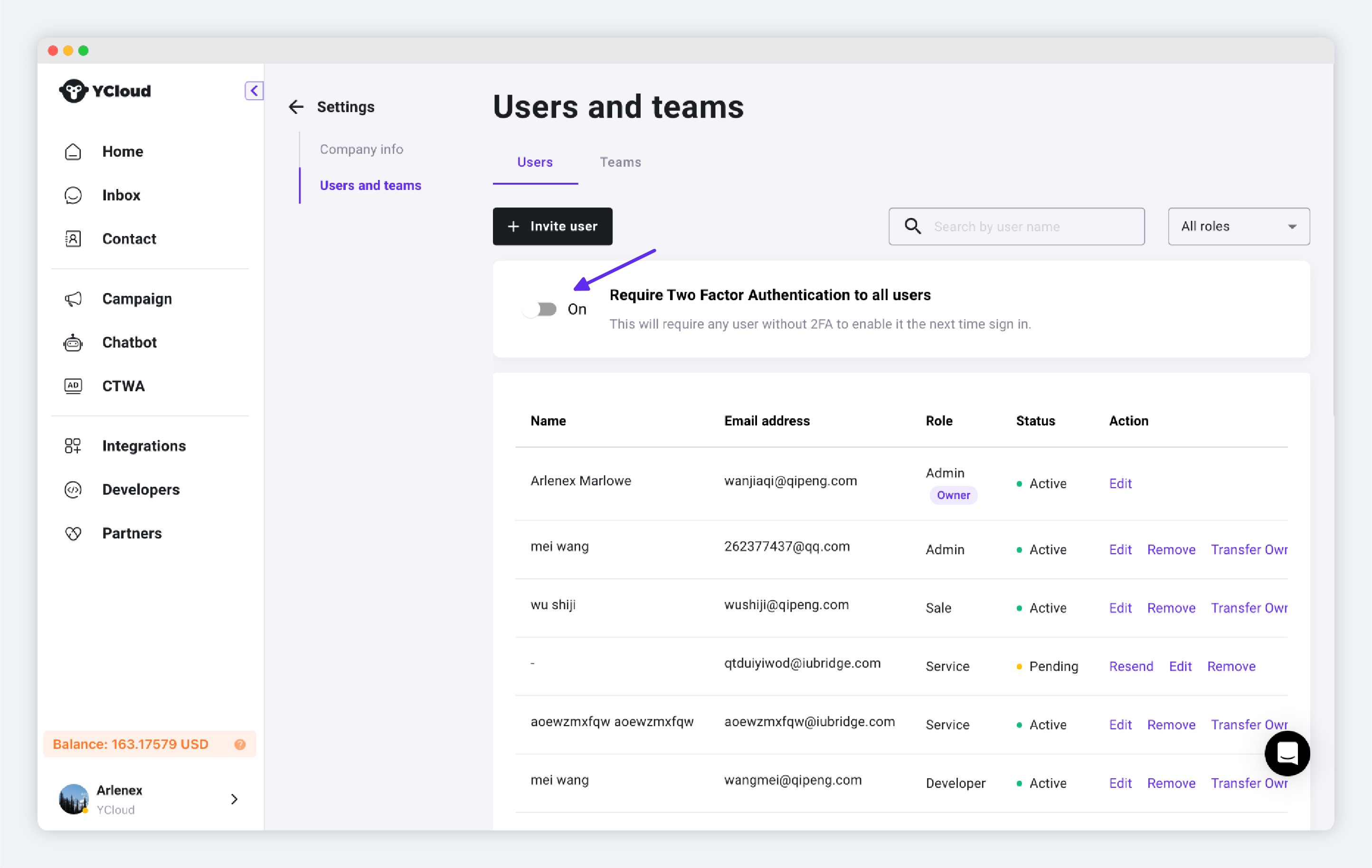 Entrance: Settings>[ User & teams](https://www.ycloud.com/console/#/app/globalSettings/general/usersAndTeams)