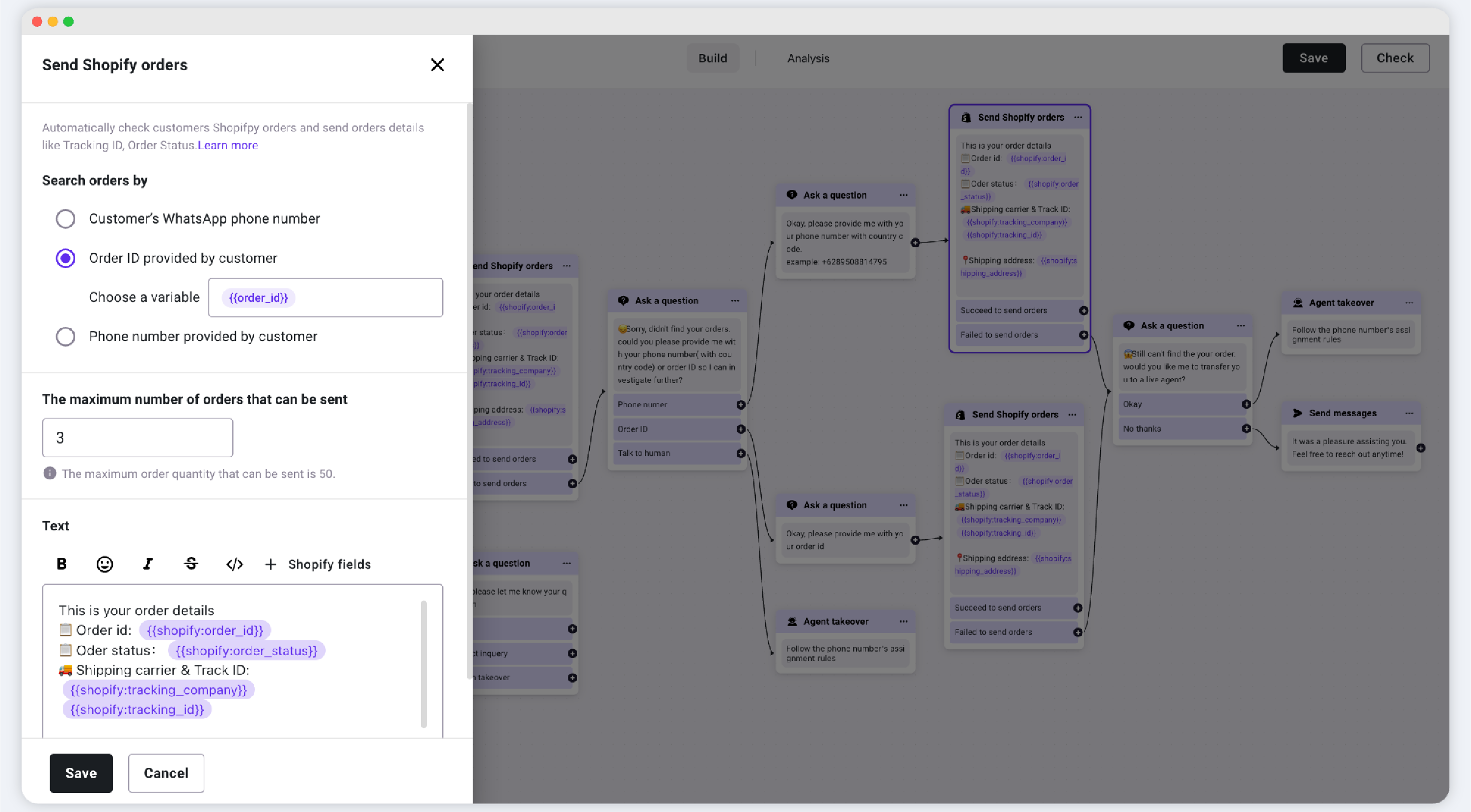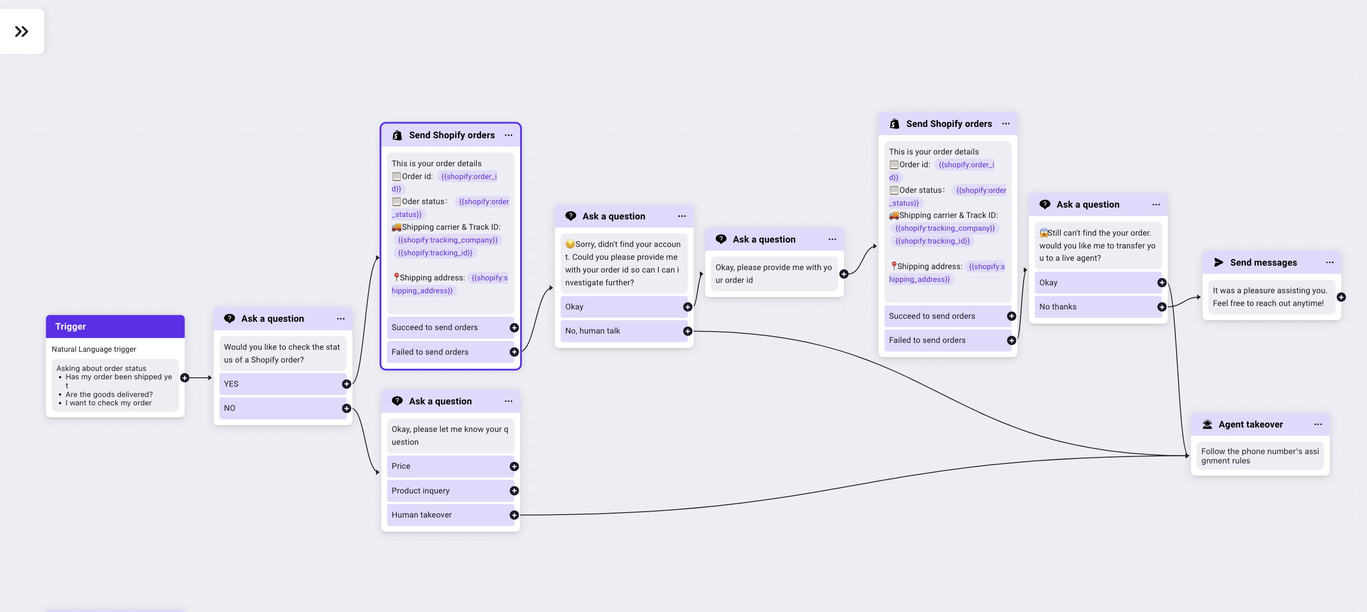 When a customer inquires about their Shopify order details, this component can automatically search for their order in your Shopify store and respond with the relevant order information.