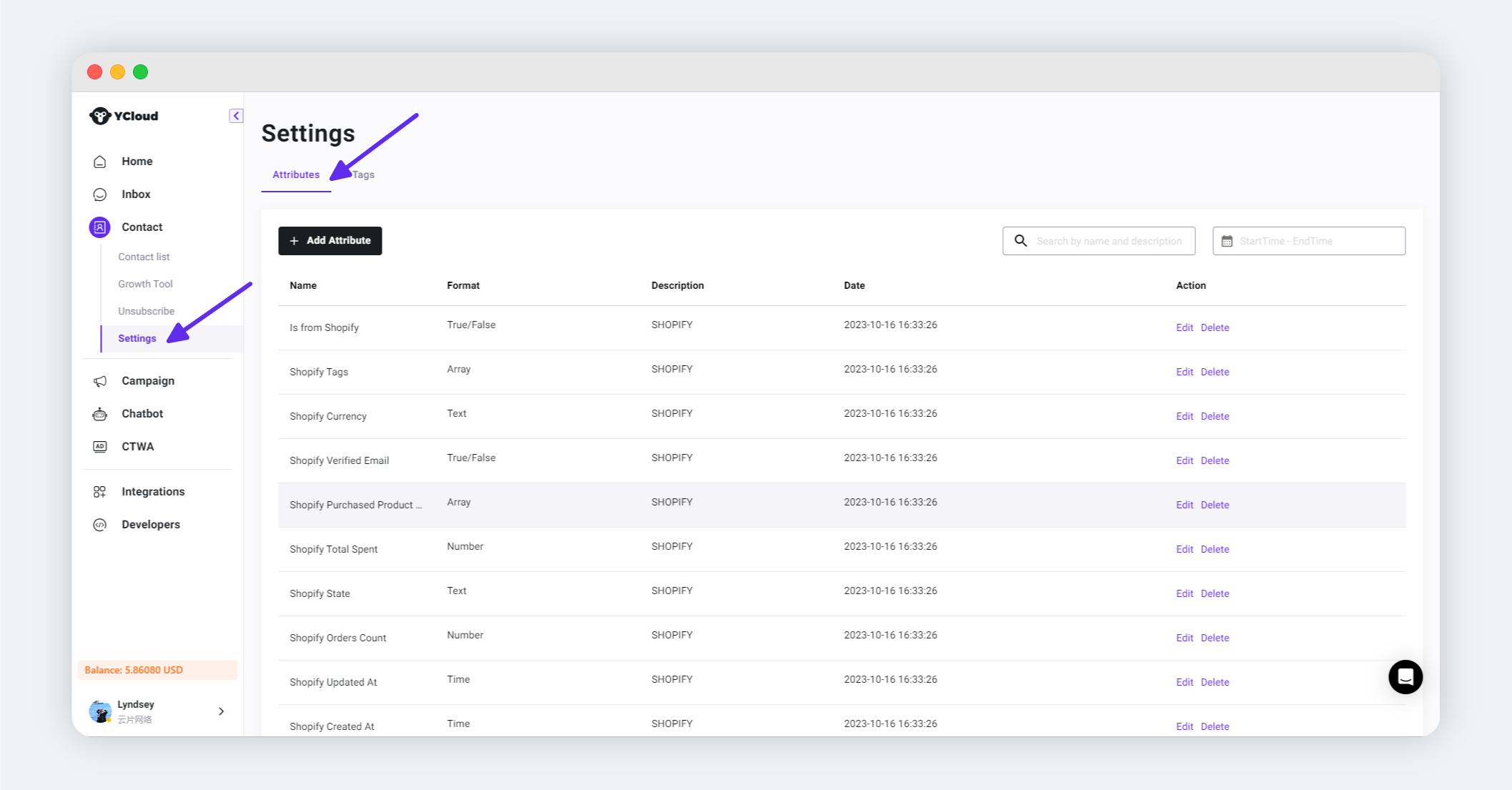 Log in to your [YCloud account](https://www.ycloud.com/console/#/entry/login), navigate to Contact > Settings > Attributes