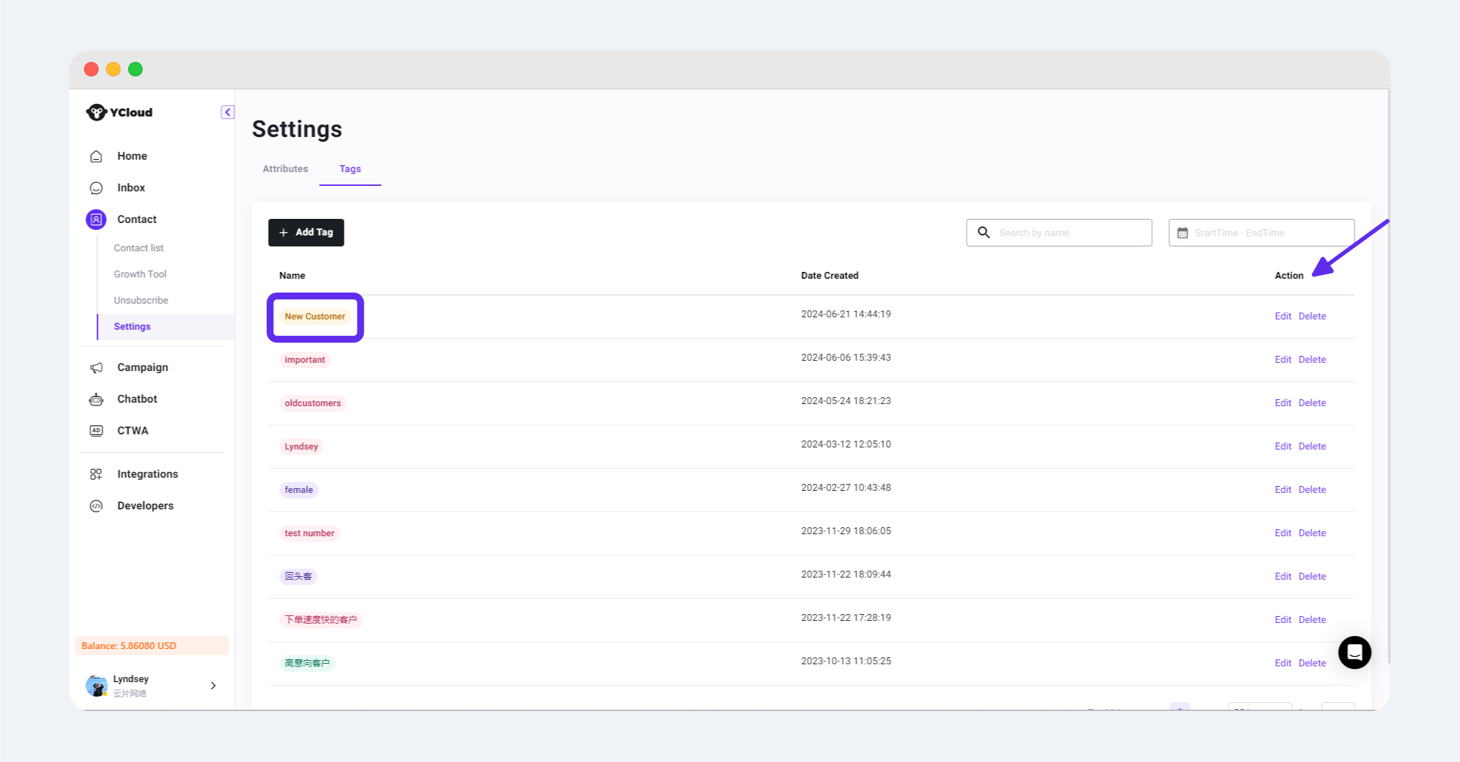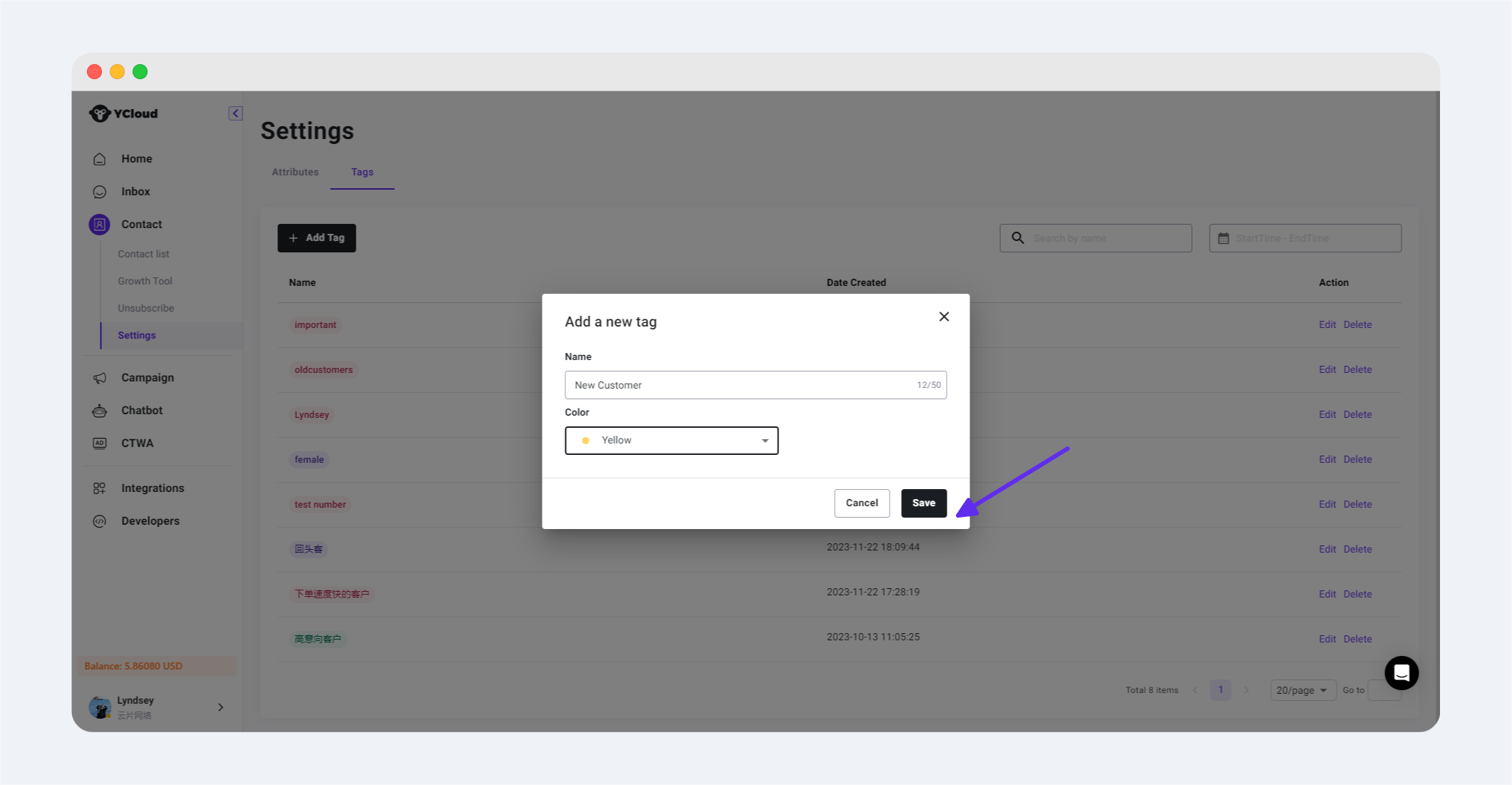Log in to your [YCloud account](https://www.ycloud.com/console/#/entry/login), navigate to Contact > Settings > Tags.