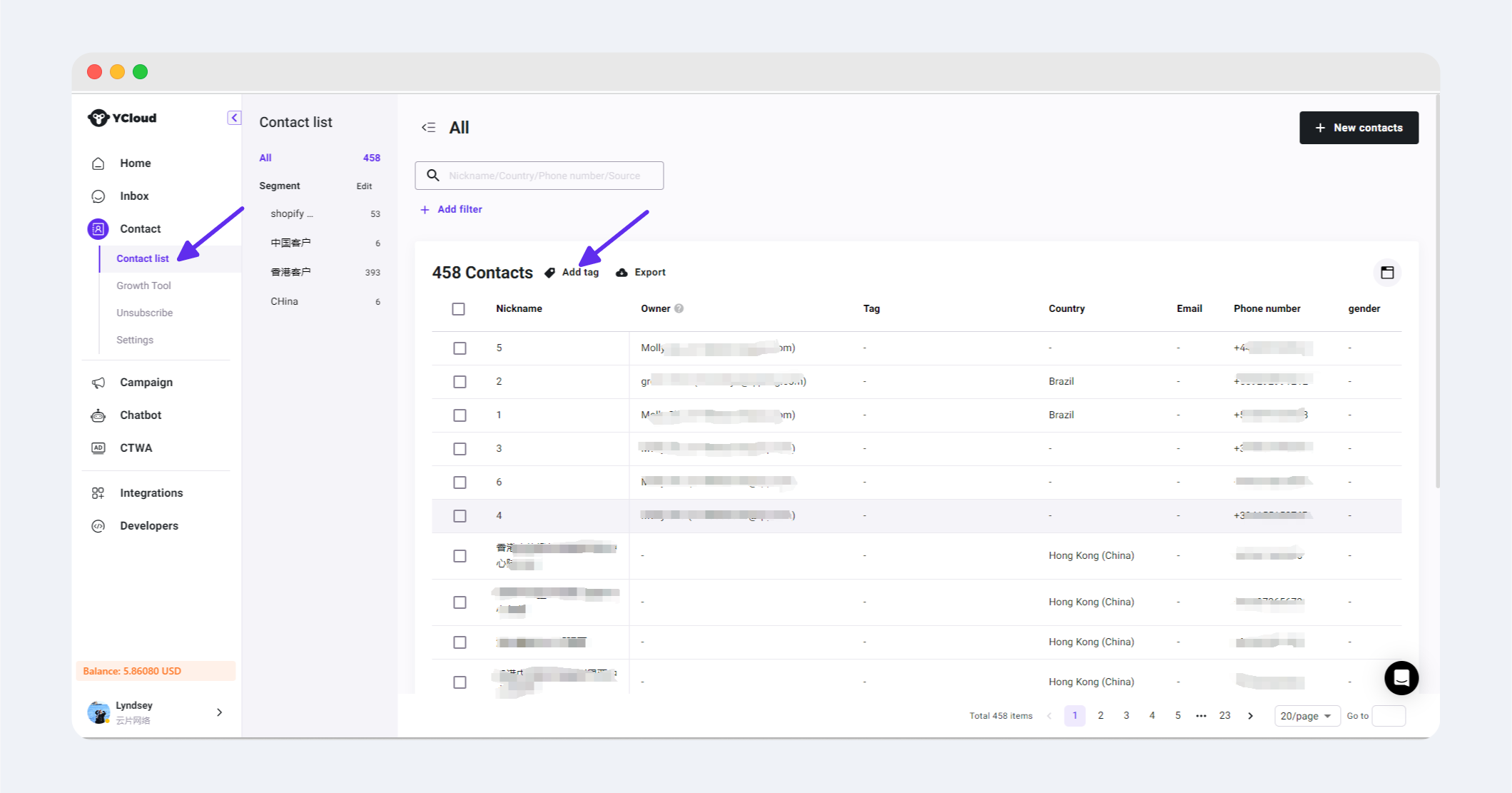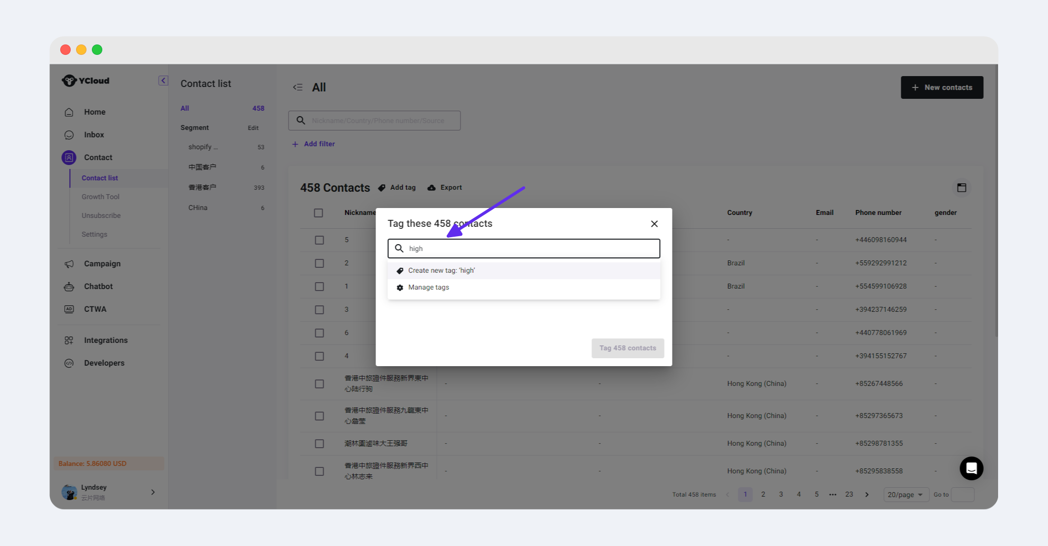 Log in to your [YCloud account](https://www.ycloud.com/console/#/entry/login), navigate to Contact > Contact list > Add tag.