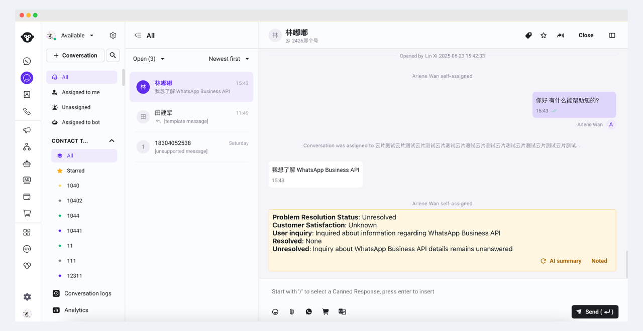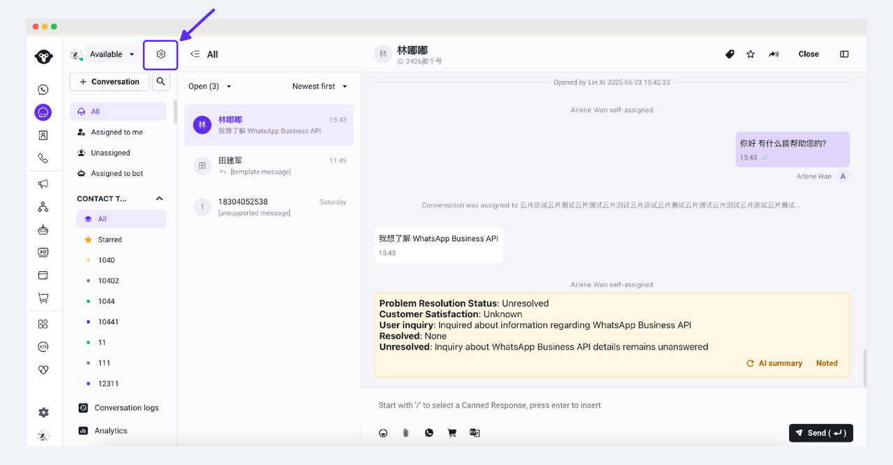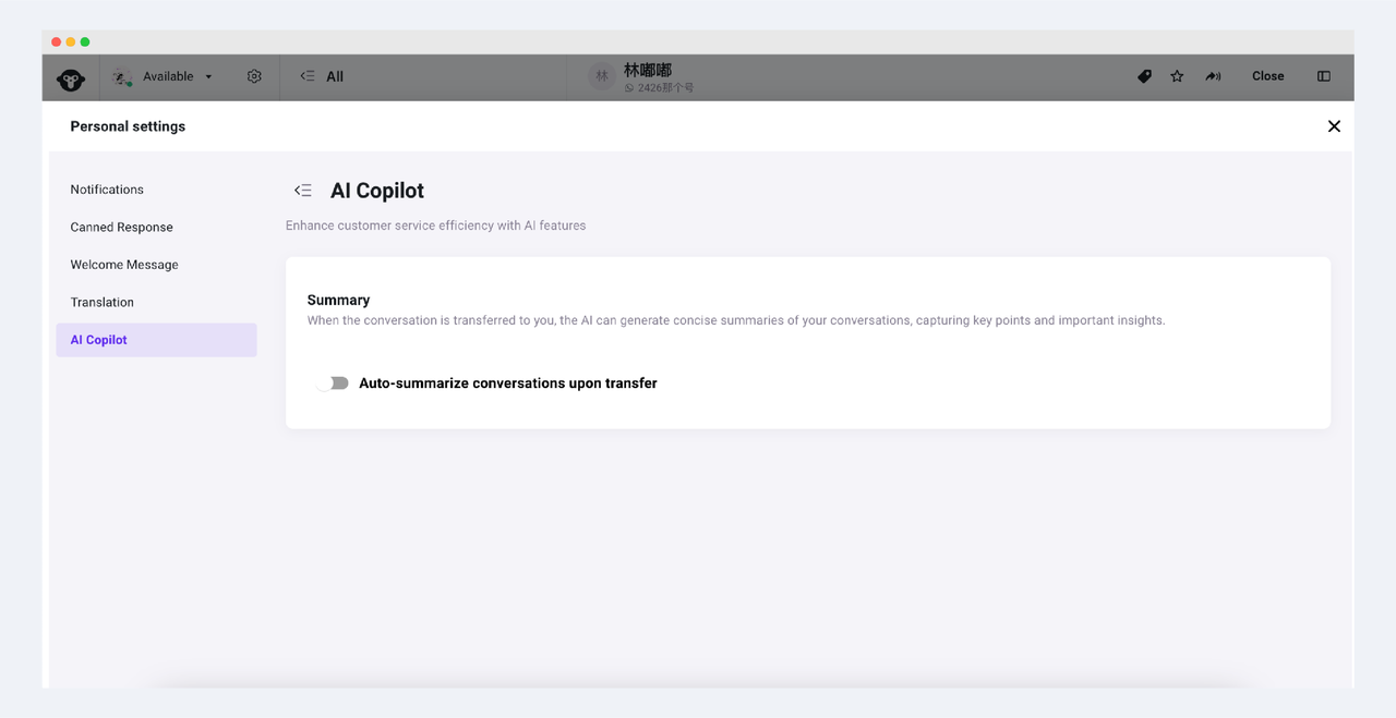 In the Settings in the lower left corner of the page, find the AI Copilot menu in the Inbox and turn on the automatic summary when the session is closed. This configuration takes effect globally. After it is turned on, all sessions in Inbox will automatically generate an AI summary when they are closed.