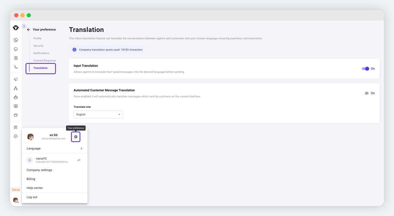3. The "Input Translation" switch controls the translation function in the Inbox input box. After turning it on, the commonly used language of the agent can be translated into the language used by the customer in the Inbox input box.