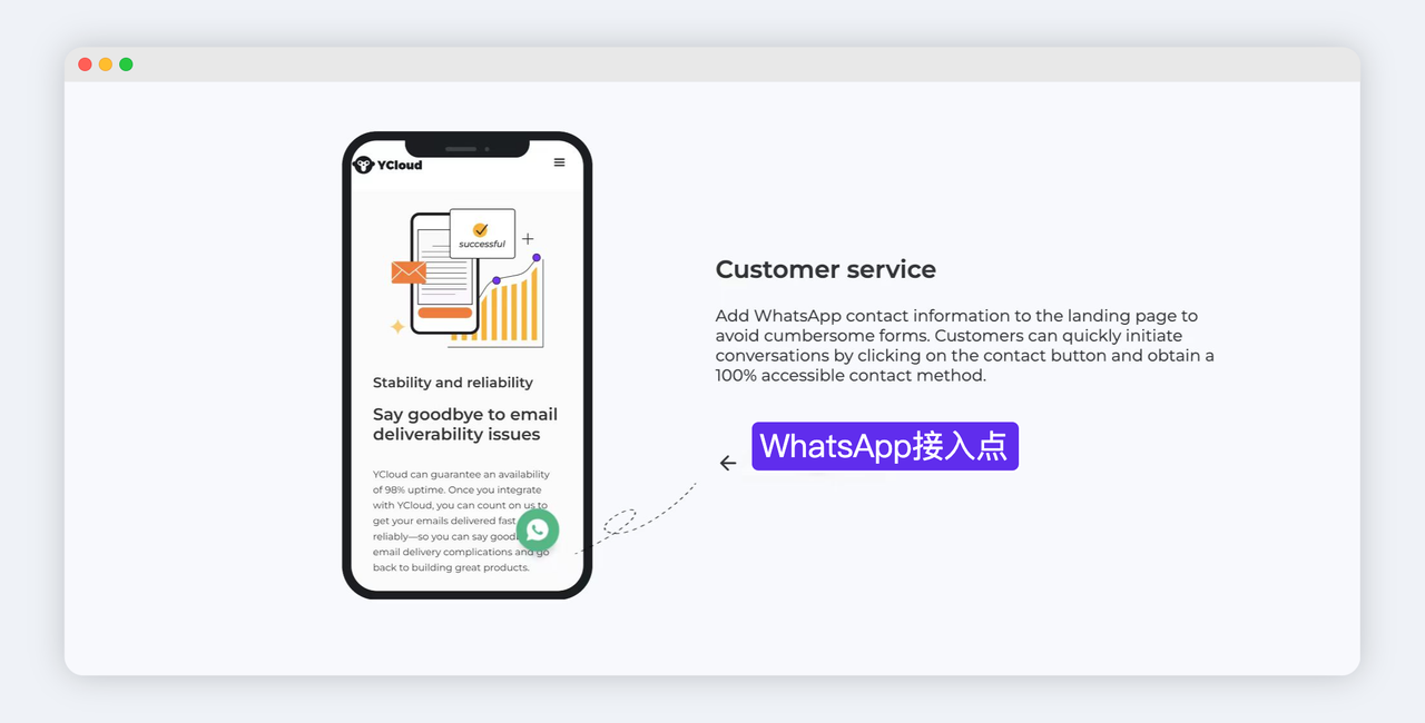 In this article, you've learned how to do customer support through the YCloud platform and WhatsApp. From account creation to configuring automated messages to training customer service teams and monitoring performance, every step is designed to improve customer experience and business efficiency. Designing chat access points is key to achieving this goal, not only making it easy for customers to communicate with businesses, but also enhancing brand exposure and customer conversion. Hopefully, this article will help your business make better use of WhatsApp as a powerful tool to improve customer support, enhance market competitiveness, and win customer trust and loyalty. If you have any questions or need further assistance, please feel free to contact the YCloud team and we look forward to working with you for a better future.