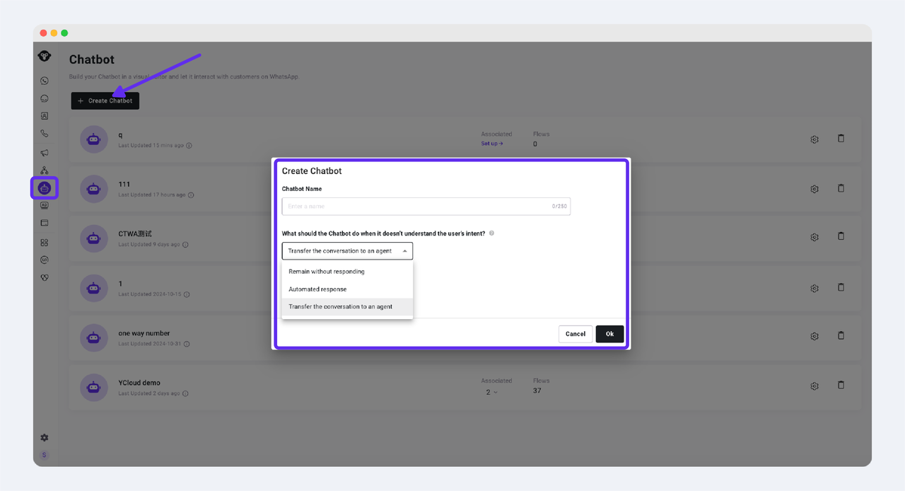 Click to view [Create a Chatbot](https://helpdocs.ycloud.com/help-center/chatbot/chuang-jian-yi-ge-chatbot?fallback=true)