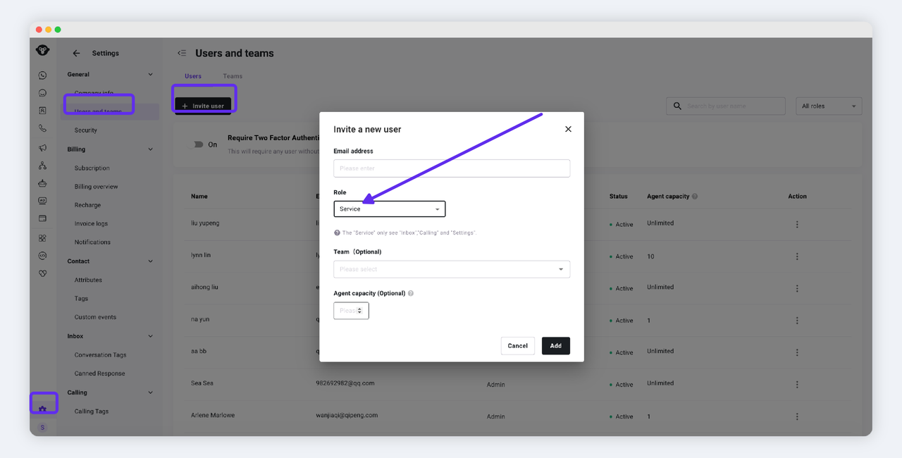 * Account in the lower left corner> [Settings](https://www.ycloud.com/console/#/app/globalSettings/general/companyInfo) > [Users and teams ](https://www.ycloud.com/console/#/app/globalSettings/general/usersAndTeams)> [Invite user](https://www.ycloud.com/console/#/app/globalSettings/general/usersAndTeams).