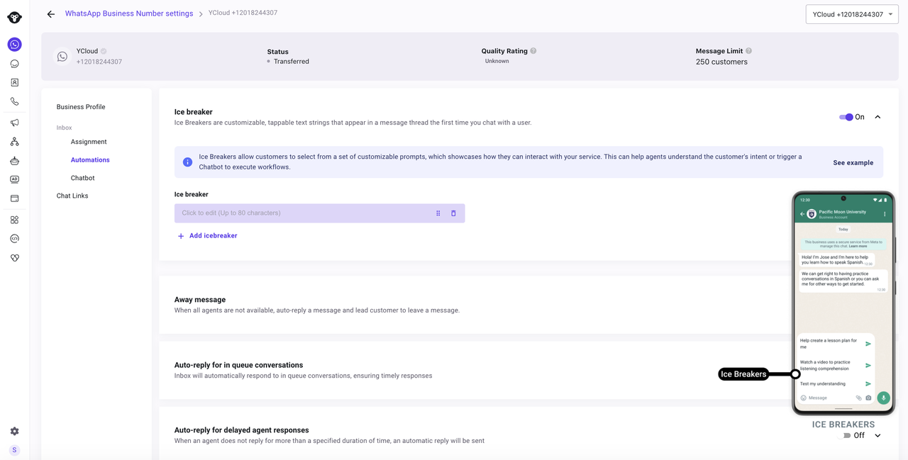 Procedure: [WhatsApp accounts](https://www.ycloud.com/console/#/app/dashboard/account) > [Number Settings](https://www.ycloud.com/console/#/app/dashboard/accountSetting/profile?redirectPath=%2Fapp%2Fdashboard%2Faccount) > [Automation](https://www.ycloud.com/console/#/app/dashboard/accountSetting/automations?redirectPath=%2Fapp%2Fdashboard%2Faccount)
