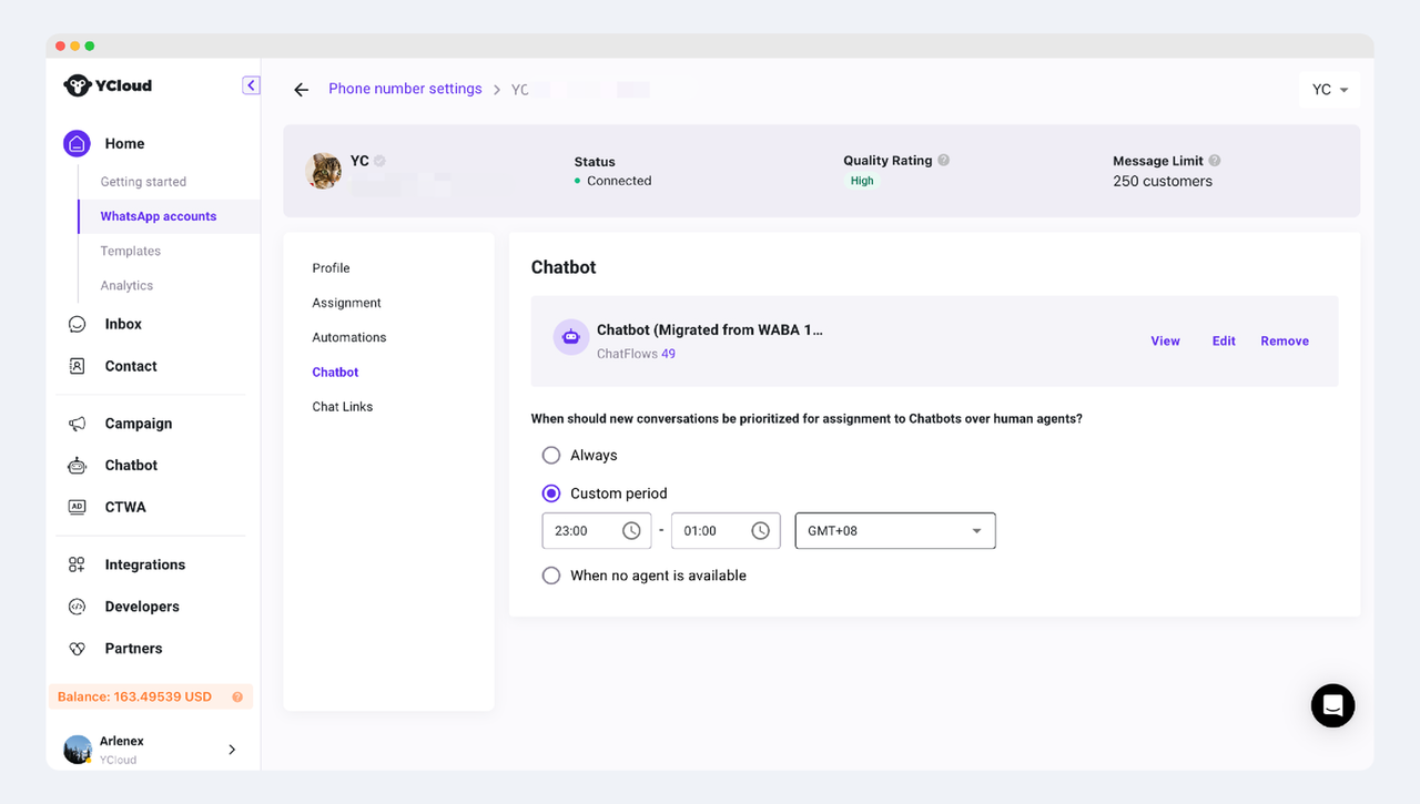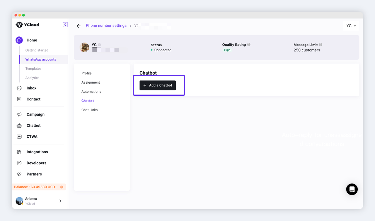 Procedure: [WhatsApp accounts](https://www.ycloud.com/console/#/app/dashboard/account) > [Number Settings](https://www.ycloud.com/console/#/app/dashboard/accountSetting/profile?redirectPath=%2Fapp%2Fdashboard%2Faccount) > [Chatbot](https://www.ycloud.com/console/#/app/dashboard/accountSetting/chatbot?redirectPath=%2Fapp%2Fdashboard%2Faccount)
