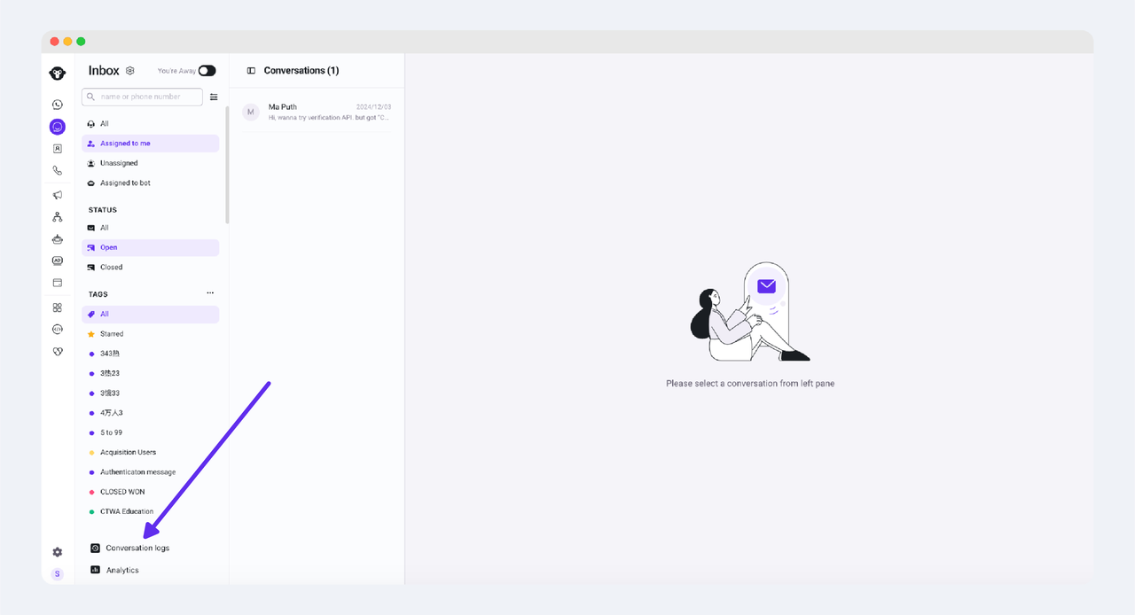 Click to view [Conversation Logs](https://helpdocs.ycloud.com/help-center/inbox/conversation-logs)
