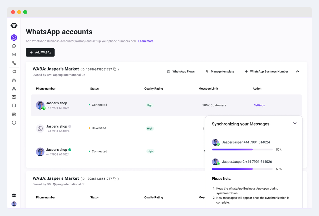After completing the authorization, if you authorize the synchronization of your chat history, we will immediately start synchronizing your chats. Please keep the WhatsApp Business App open during synchronization and note that new messages will only appear in Inbox after the synchronization is done.