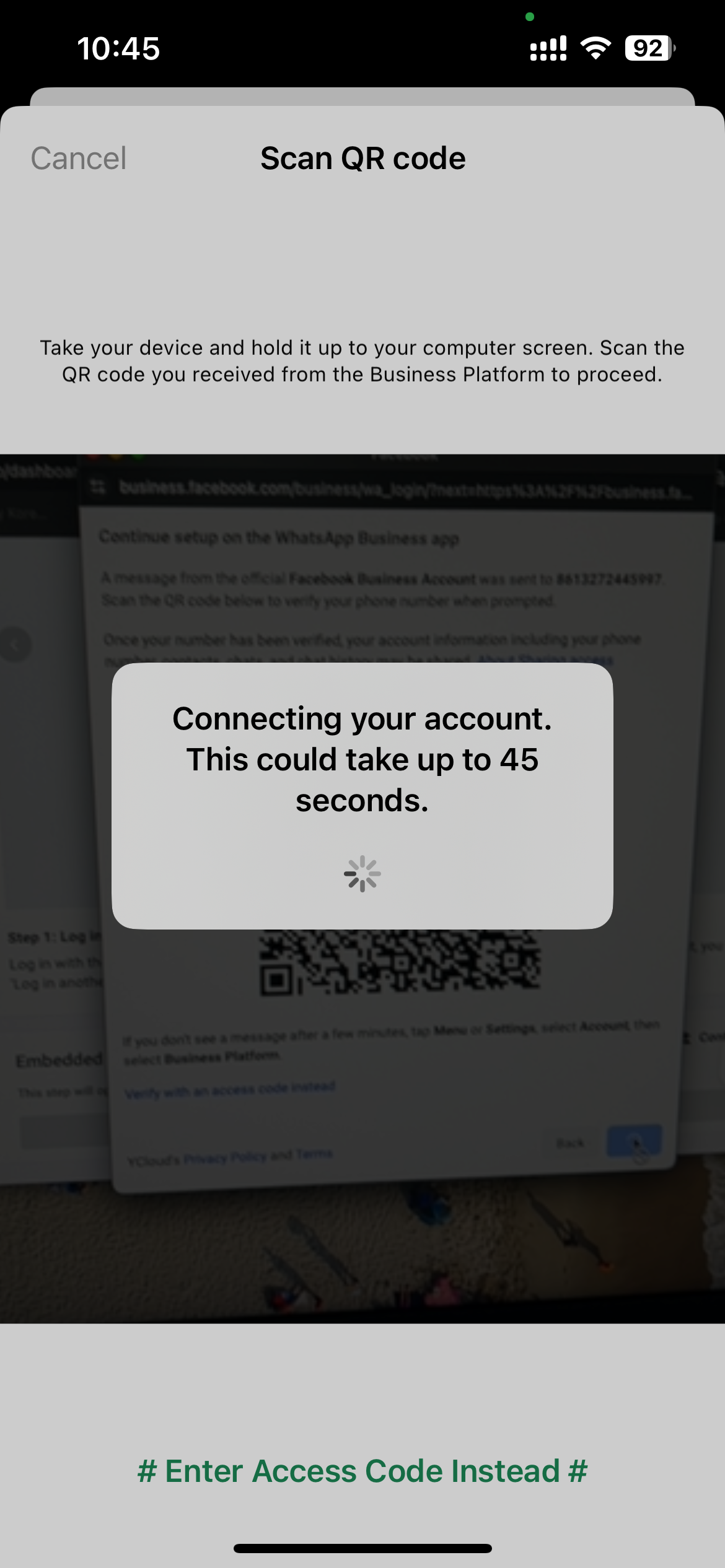 The WhatsApp message instructs you to use the app to scan the QR code displayed in Embedded Signup. Tapping the button and you will be given the option to share your WhatsApp Business app messaging history with us.