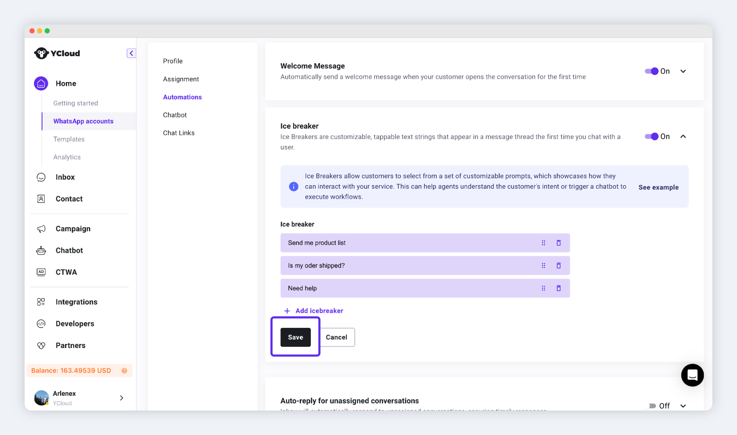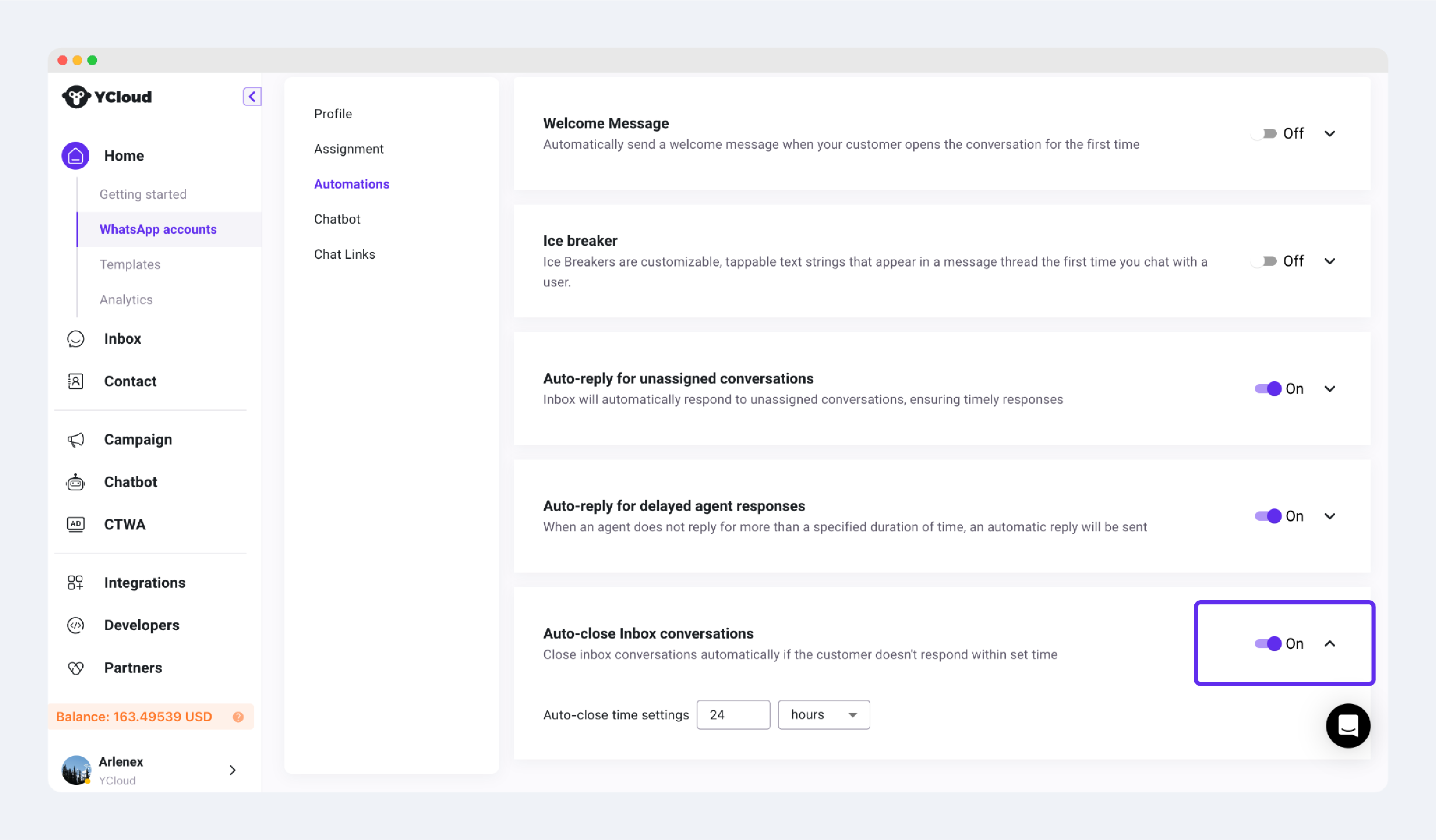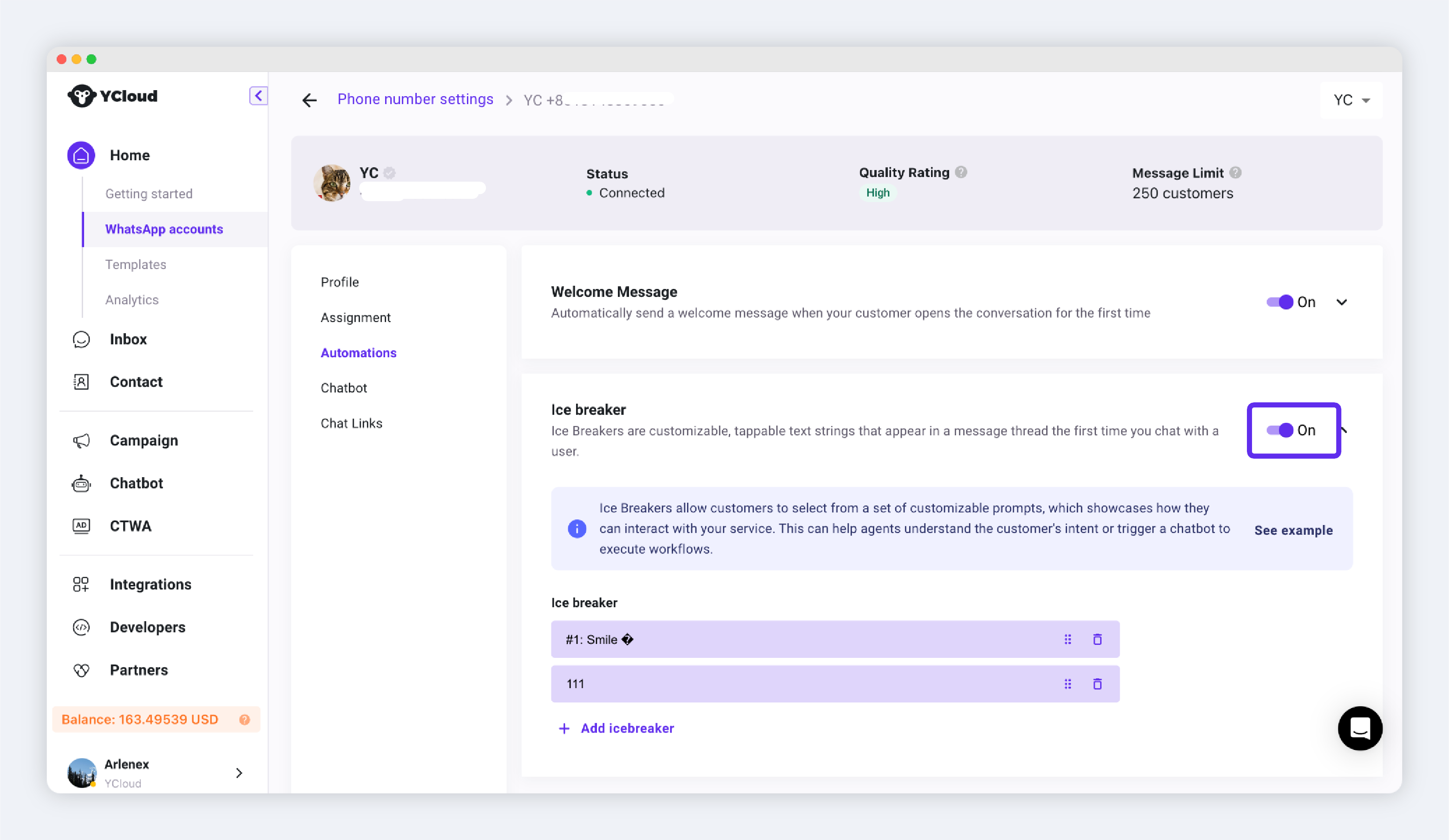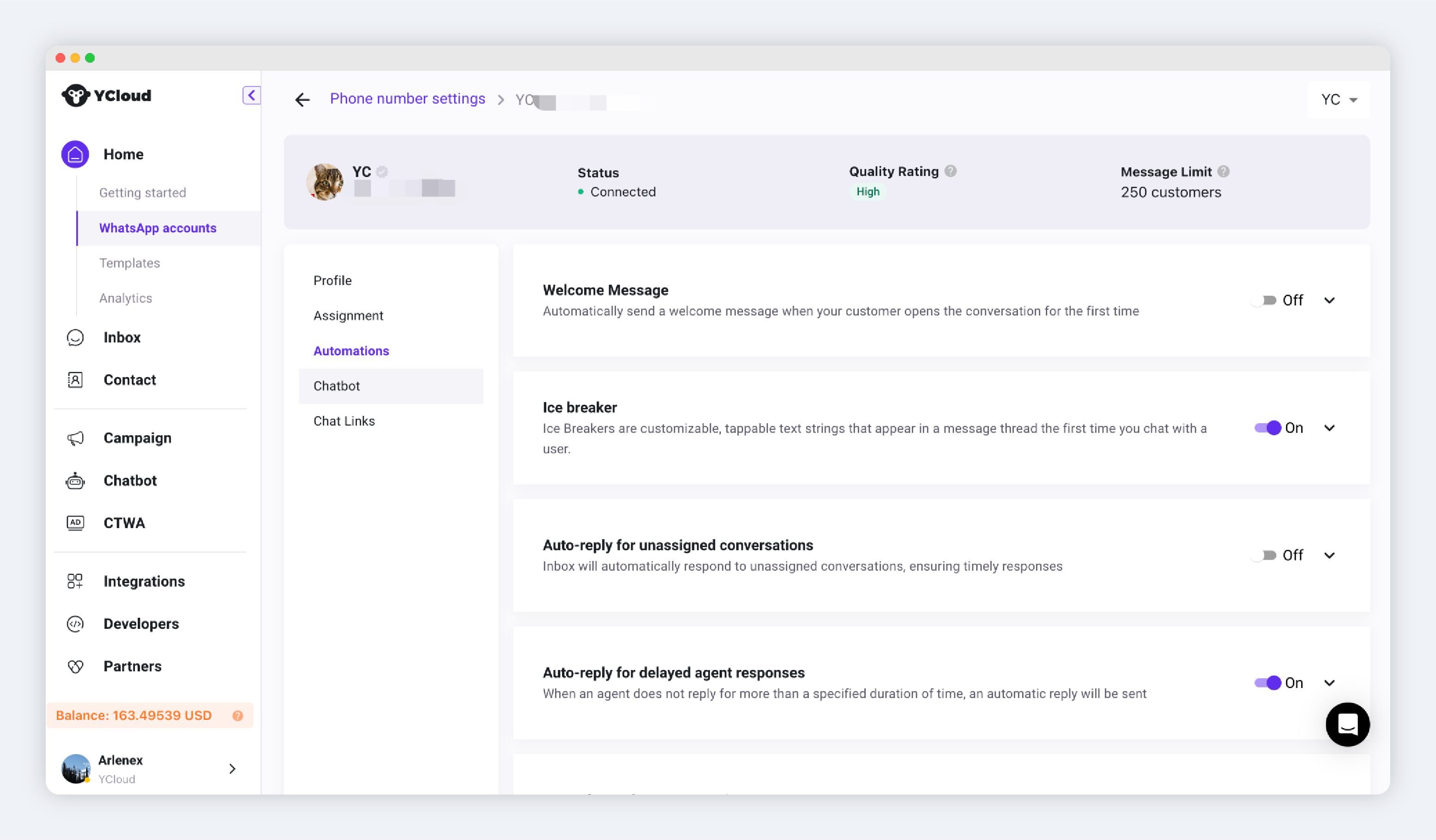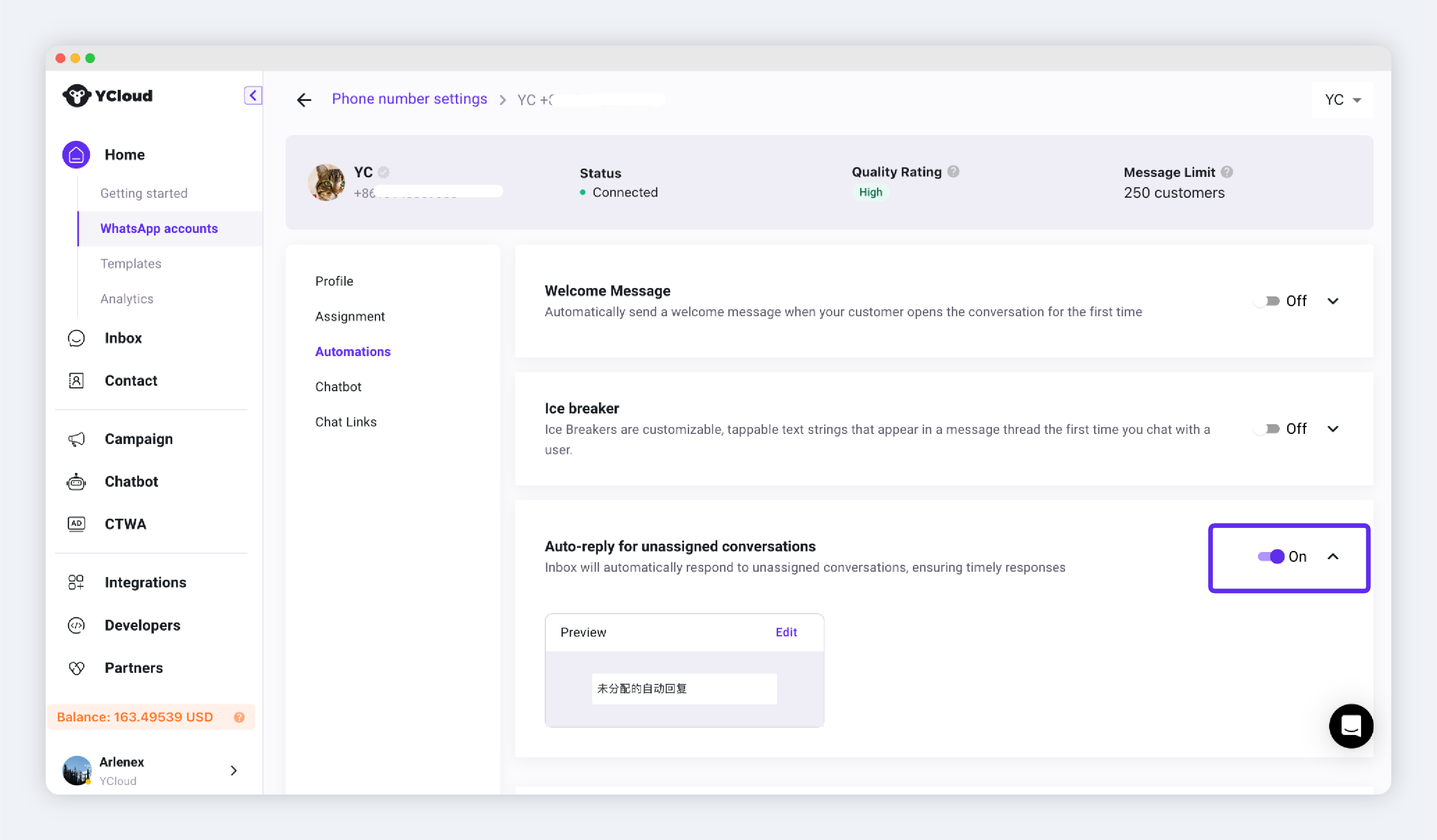 * [Auto-reply for in queue conversations](https://helpdocs.ycloud.com/help-center/whatsapp-accounts-zhang-hao-guan-li/shou-ji-hao-ma-guan-li/zi-dong-hua#auto-reply-for-in-queue-conversations)