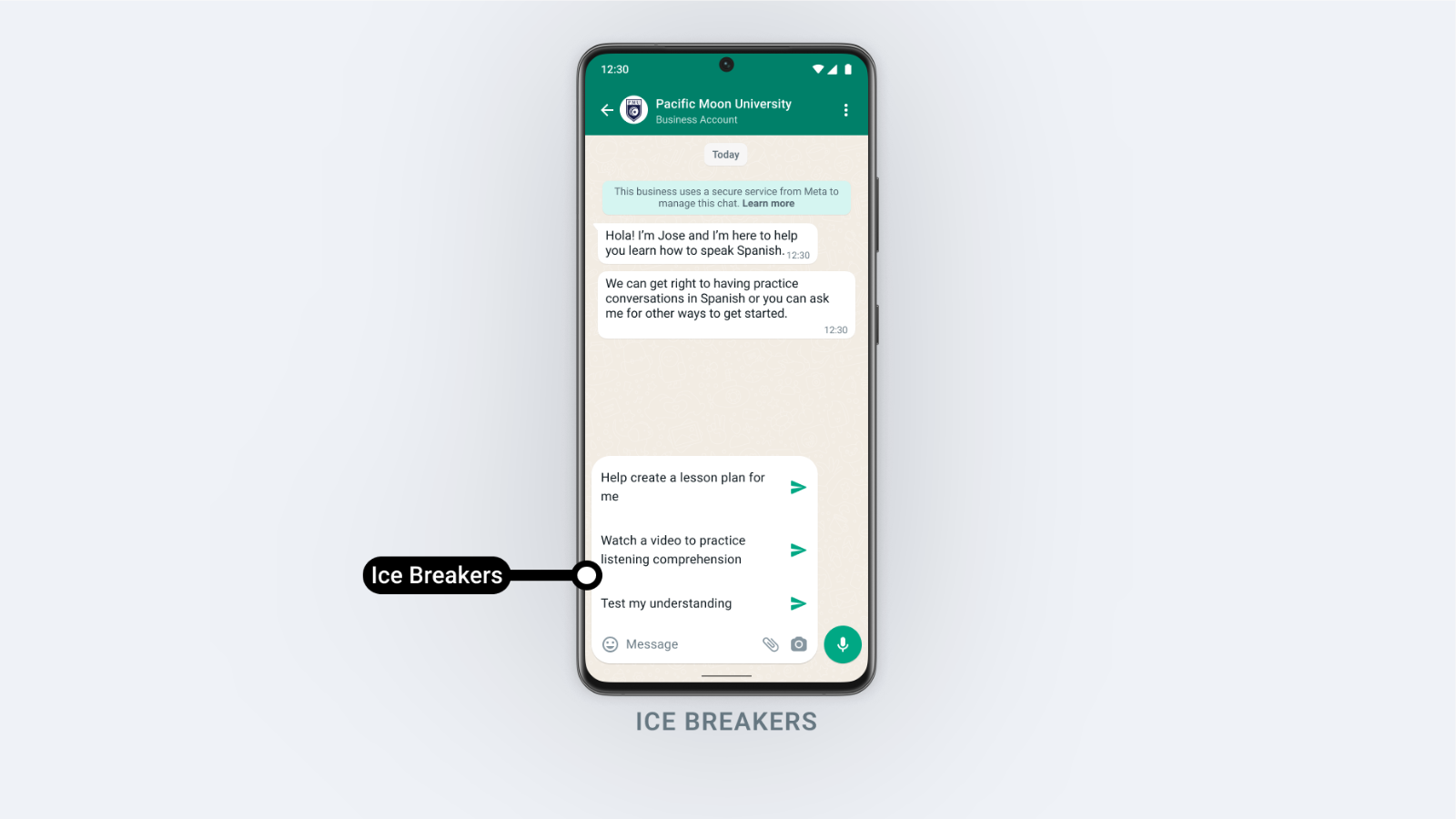 **Rules**: You can configure up to 4 ice breakers on a phone number. Each ice breaker can have up to 80 characters. Emojis are not supported.