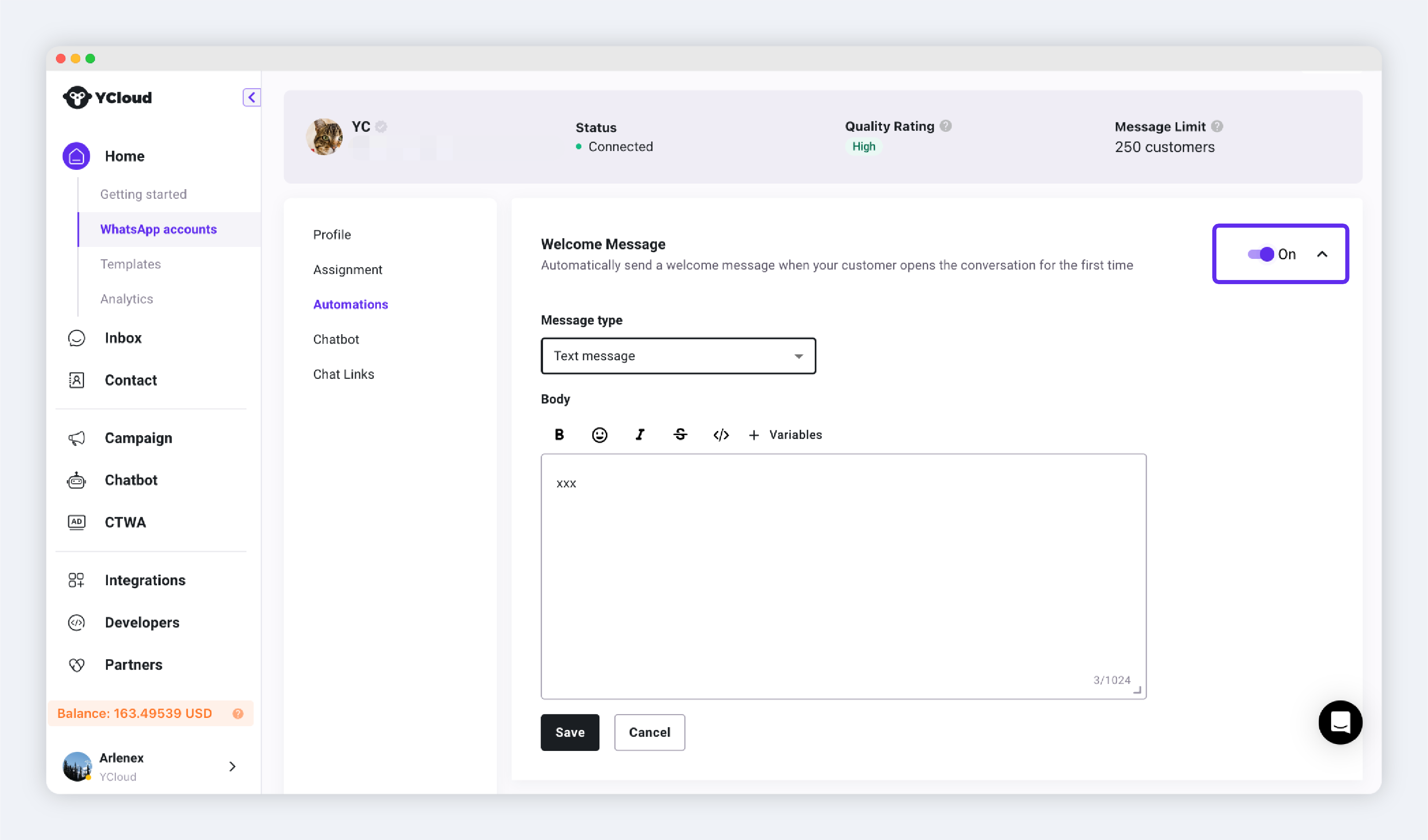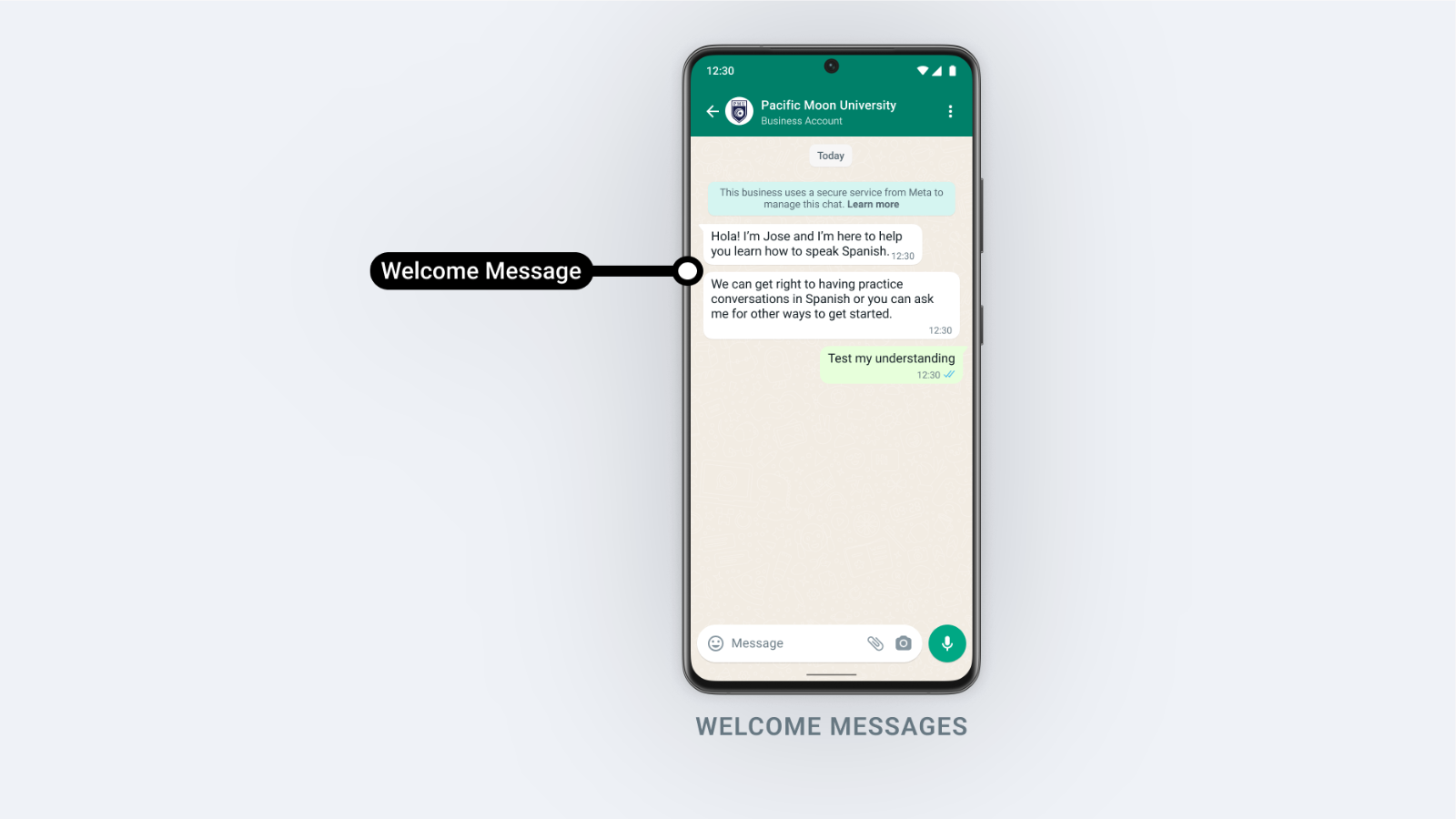 **Charges**: Although welcome messages are proactively sent by the business, the messages sent will be charged as service conversation type.