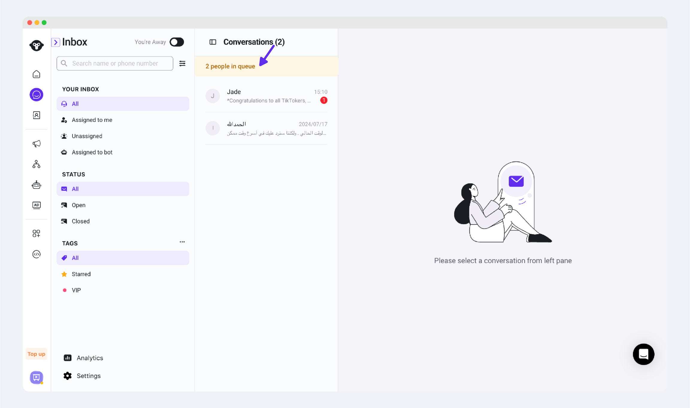 If a staff member who has reached their reception limit closes one of their ongoing conversations, a conversation from the queue will automatically be assigned to their inbox.