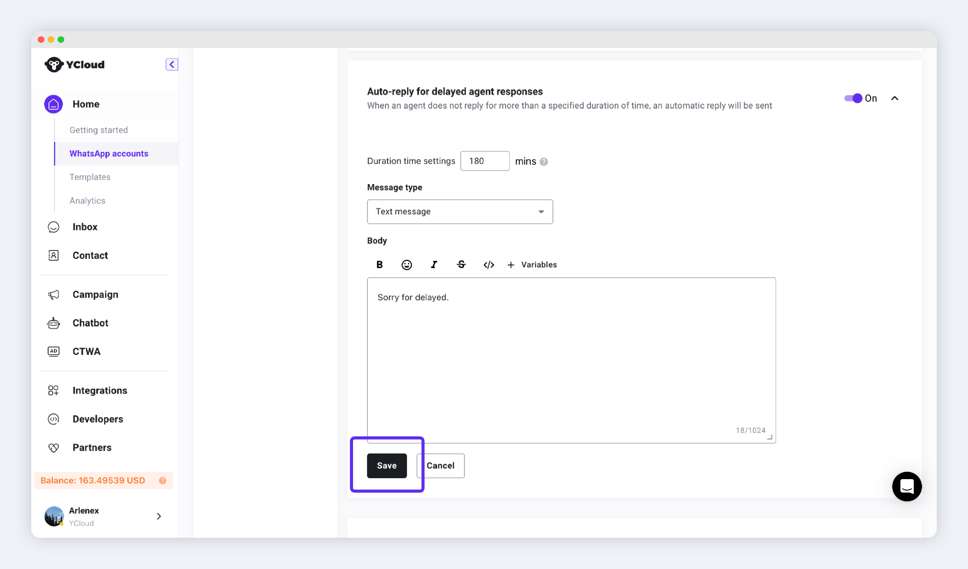 <figure><img src="https://3466127247-files.gitbook.io/~/files/v0/b/gitbook-x-prod.appspot.com/o/spaces%2FSIAnjLP6KQY5rvyuaq5K%2Fuploads%2FP1covNaho155zQF9VnSu%2Fimage%20(238).png?alt=media&#x26;token=18d54d65-b959-479c-83ea-e7b22aaadc0f" alt=""><figcaption><p>Edit and save Auto-reply for delayed agent responses</p></figcaption></figure>