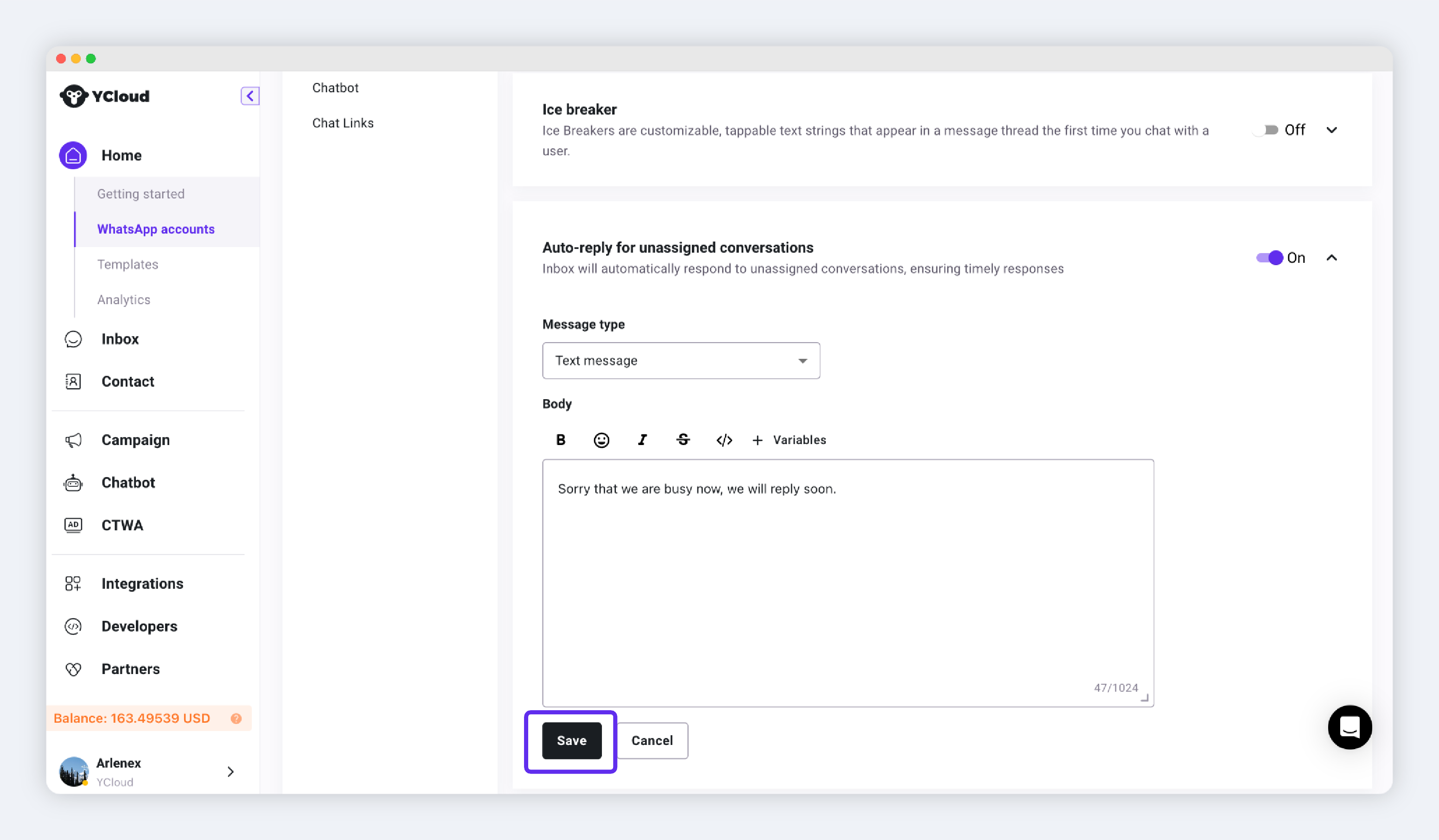<figure><img src="https://3466127247-files.gitbook.io/~/files/v0/b/gitbook-x-prod.appspot.com/o/spaces%2FSIAnjLP6KQY5rvyuaq5K%2Fuploads%2FhUOfCv7Z90u2I9t5N1WU%2Fimage%20(235).png?alt=media&#x26;token=85cc63d8-7d08-452a-96fb-8e7410378537" alt=""><figcaption><p>Edit and save auto-reply for unassigned conversations</p></figcaption></figure>