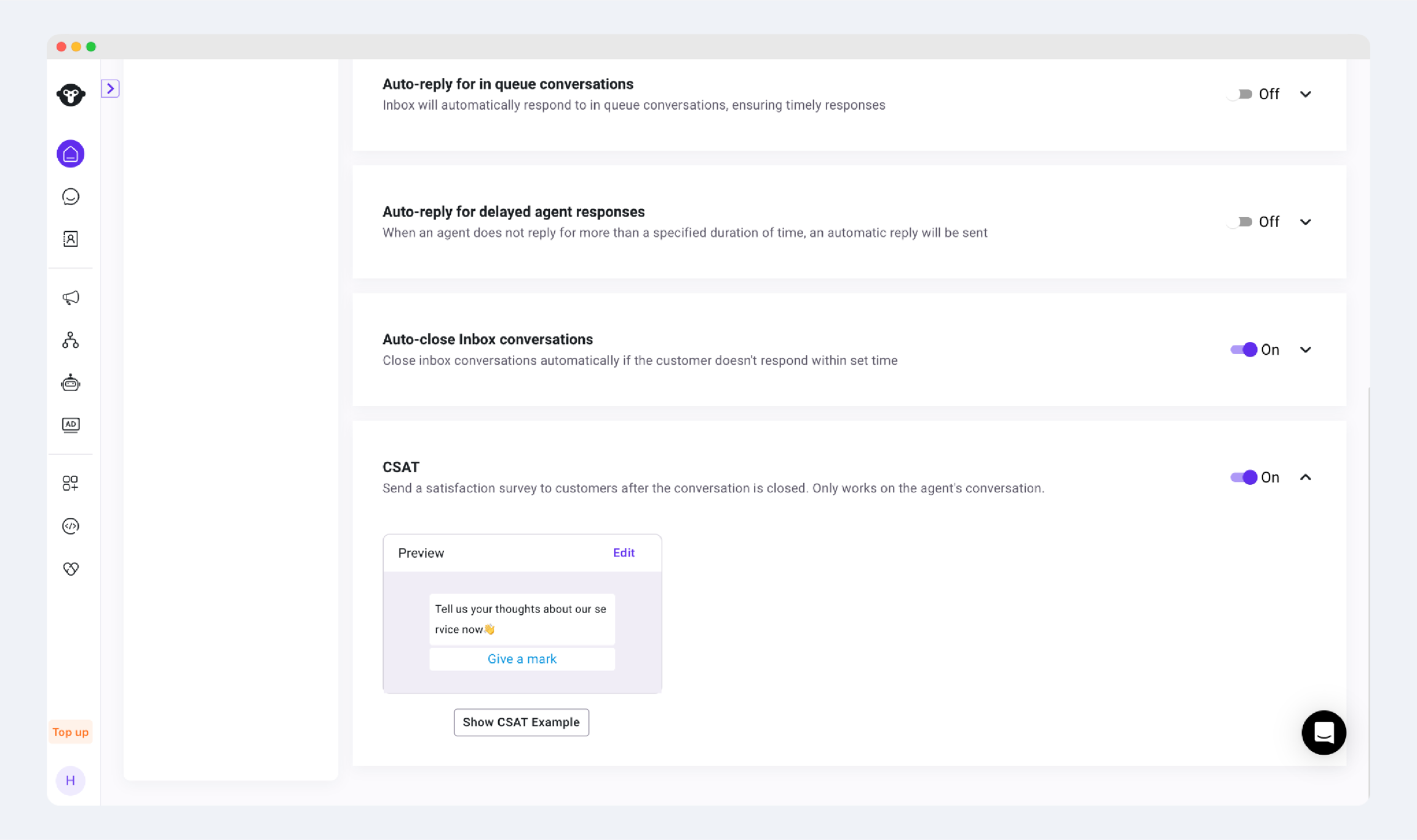 <figure><img src="https://3466127247-files.gitbook.io/~/files/v0/b/gitbook-x-prod.appspot.com/o/spaces%2FSIAnjLP6KQY5rvyuaq5K%2Fuploads%2F2QFv7DE5LdNDnDcpVML3%2Fimage%20(239).png?alt=media&#x26;token=9f4c262f-58c0-4e39-8e20-cdf4e3a0f604" alt=""><figcaption><p>Enable auto-close Inbox conversation</p></figcaption></figure>