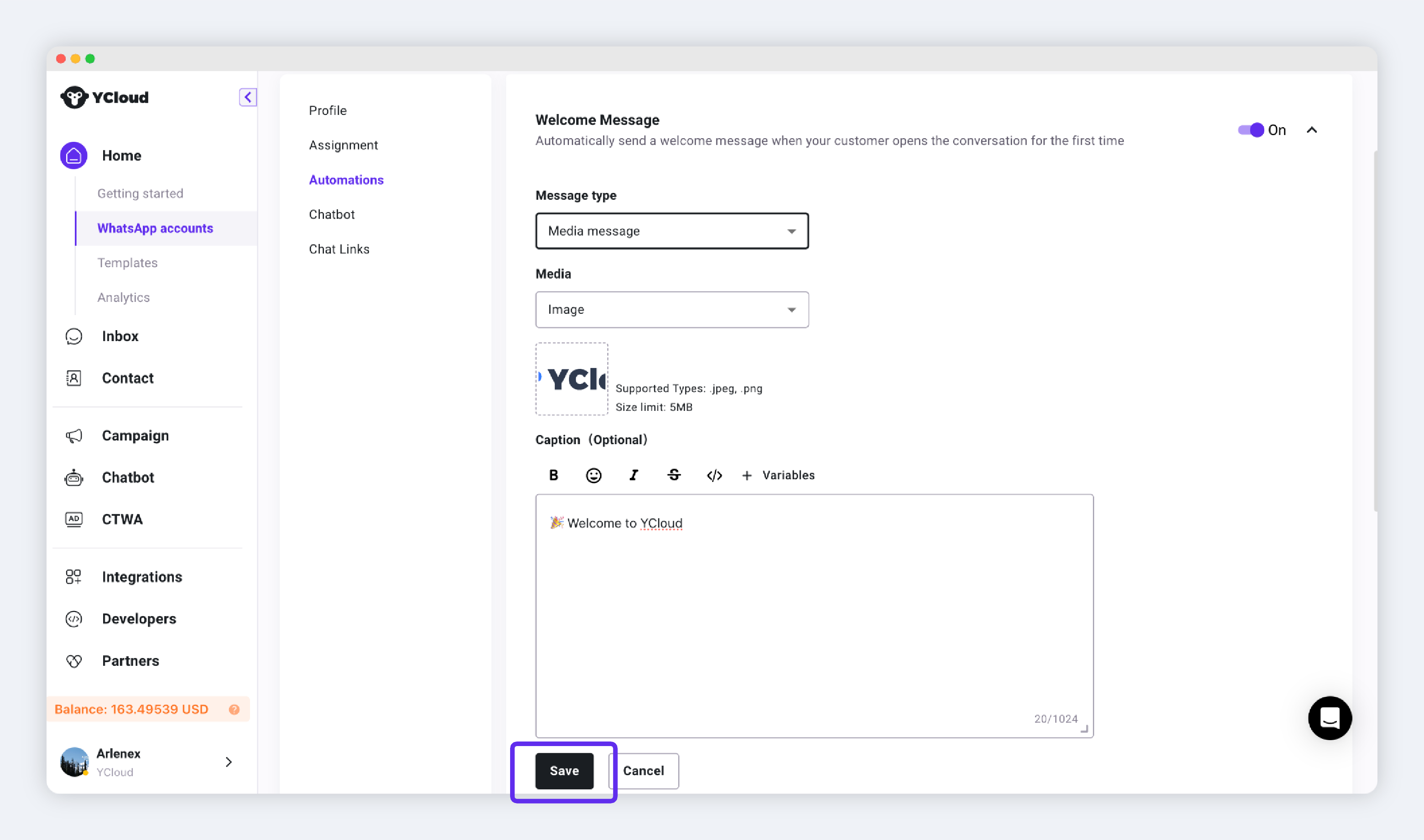 <figure><img src="https://3466127247-files.gitbook.io/~/files/v0/b/gitbook-x-prod.appspot.com/o/spaces%2FSIAnjLP6KQY5rvyuaq5K%2Fuploads%2FvBQPGnqY0AXTgr9LXIbi%2Fimage%20(221).png?alt=media&#x26;token=18e974fc-479b-464f-b41b-17cce3e567b8" alt=""><figcaption><p>Save welcome message</p></figcaption></figure>