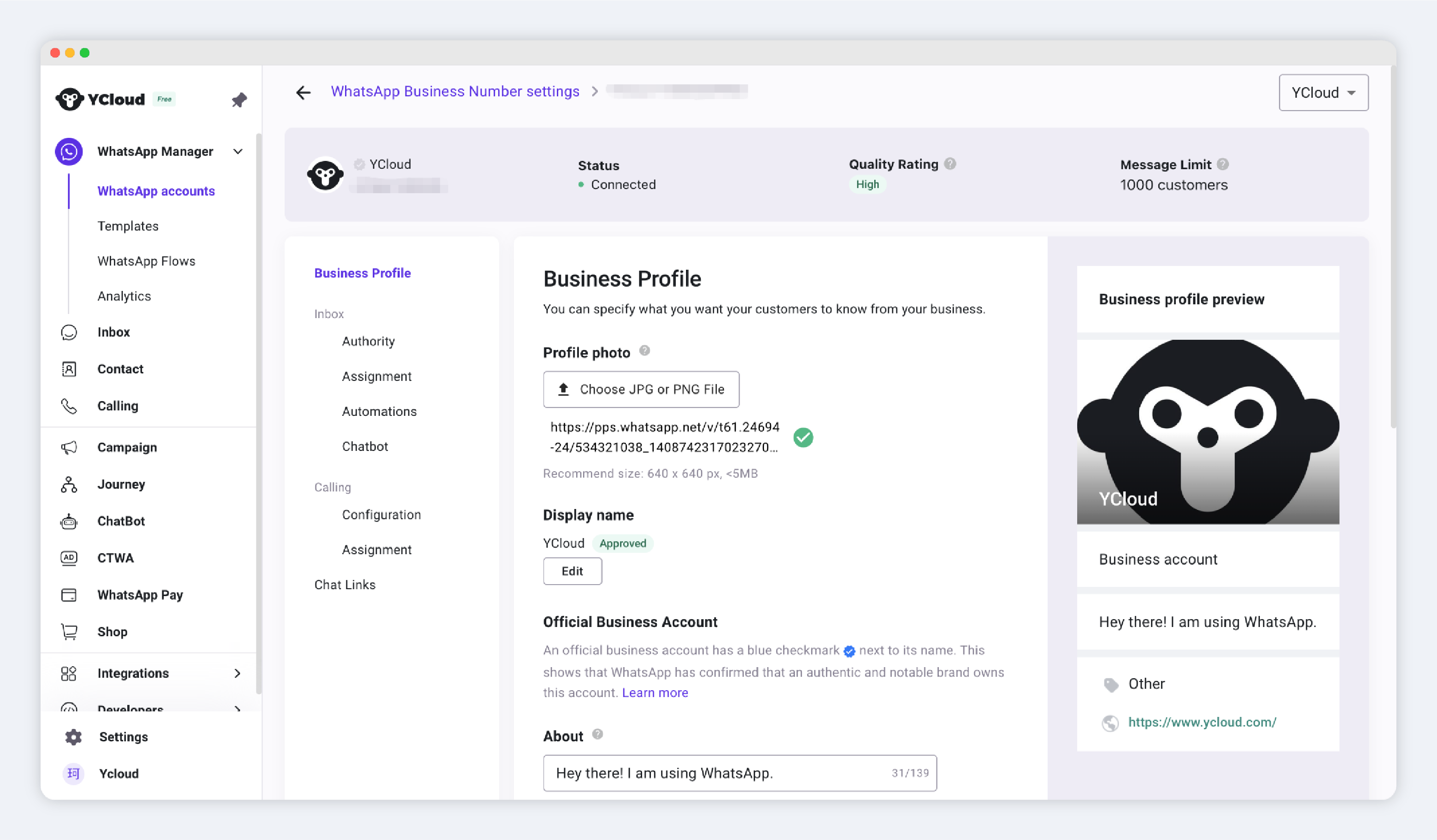 Go to the [WhatsApp accounts](https://www.ycloud.com/console/#/app/dashboard/account) page and click on the Settings of the phone number.