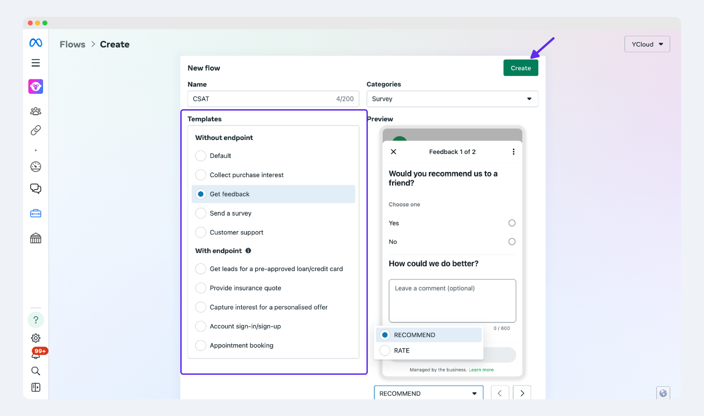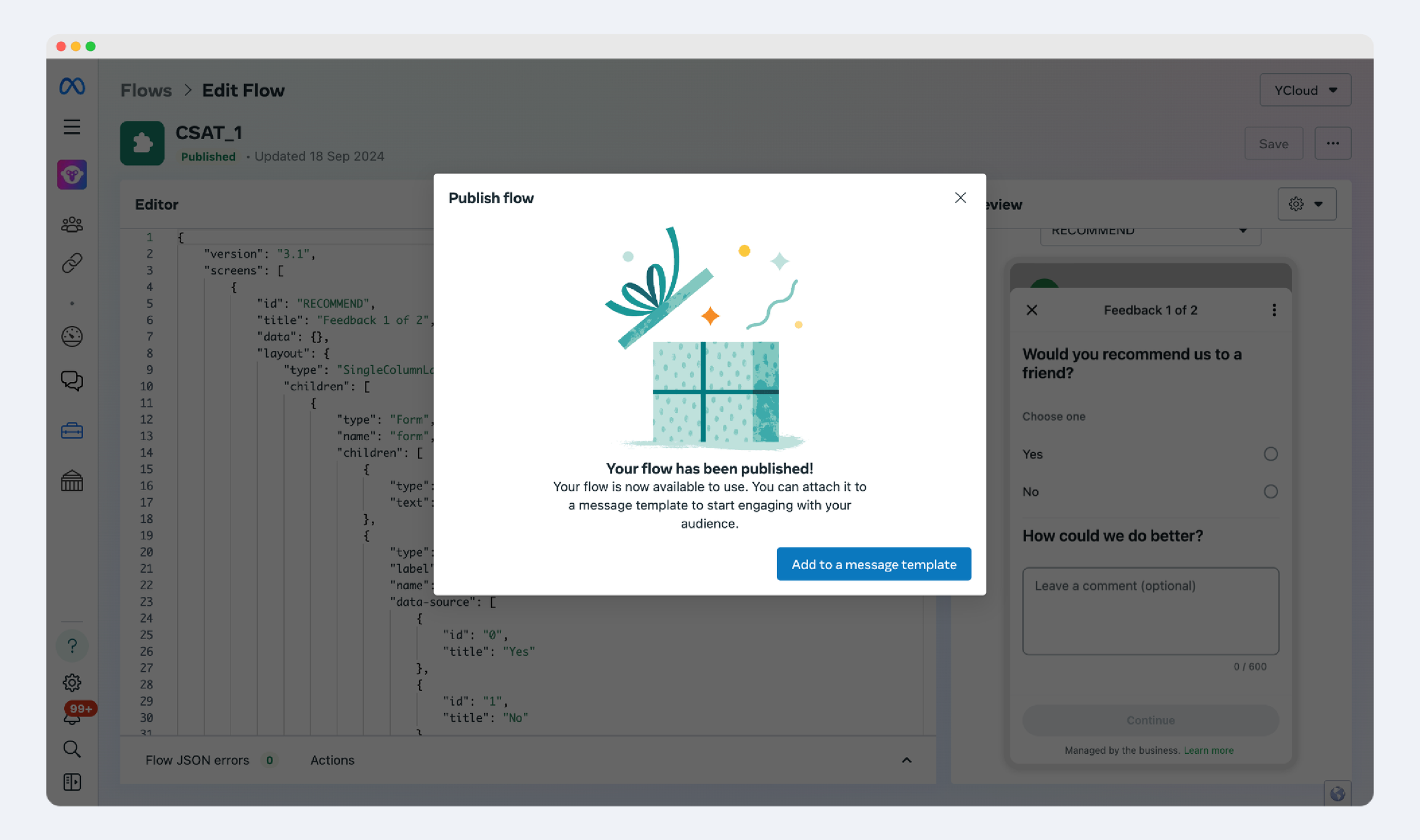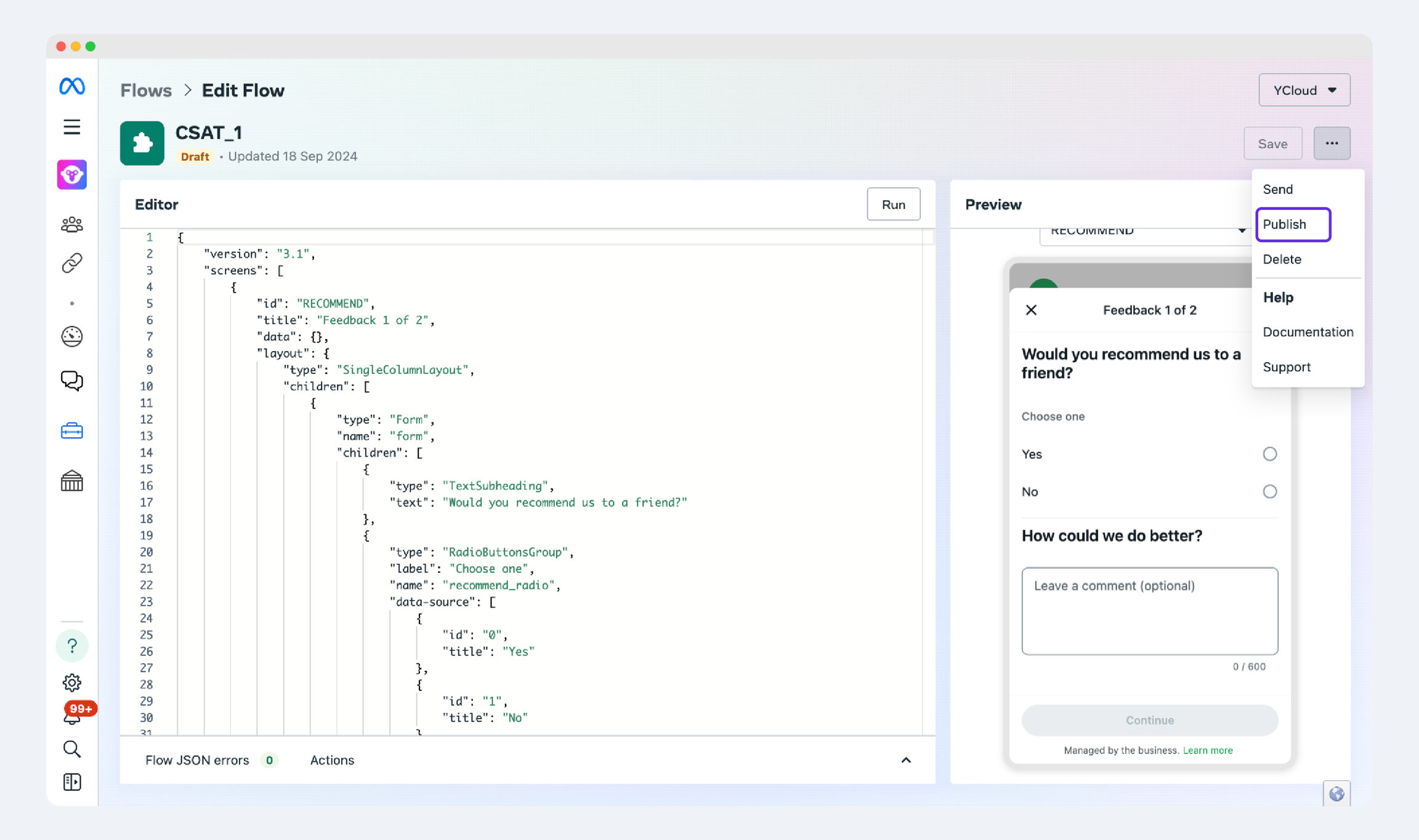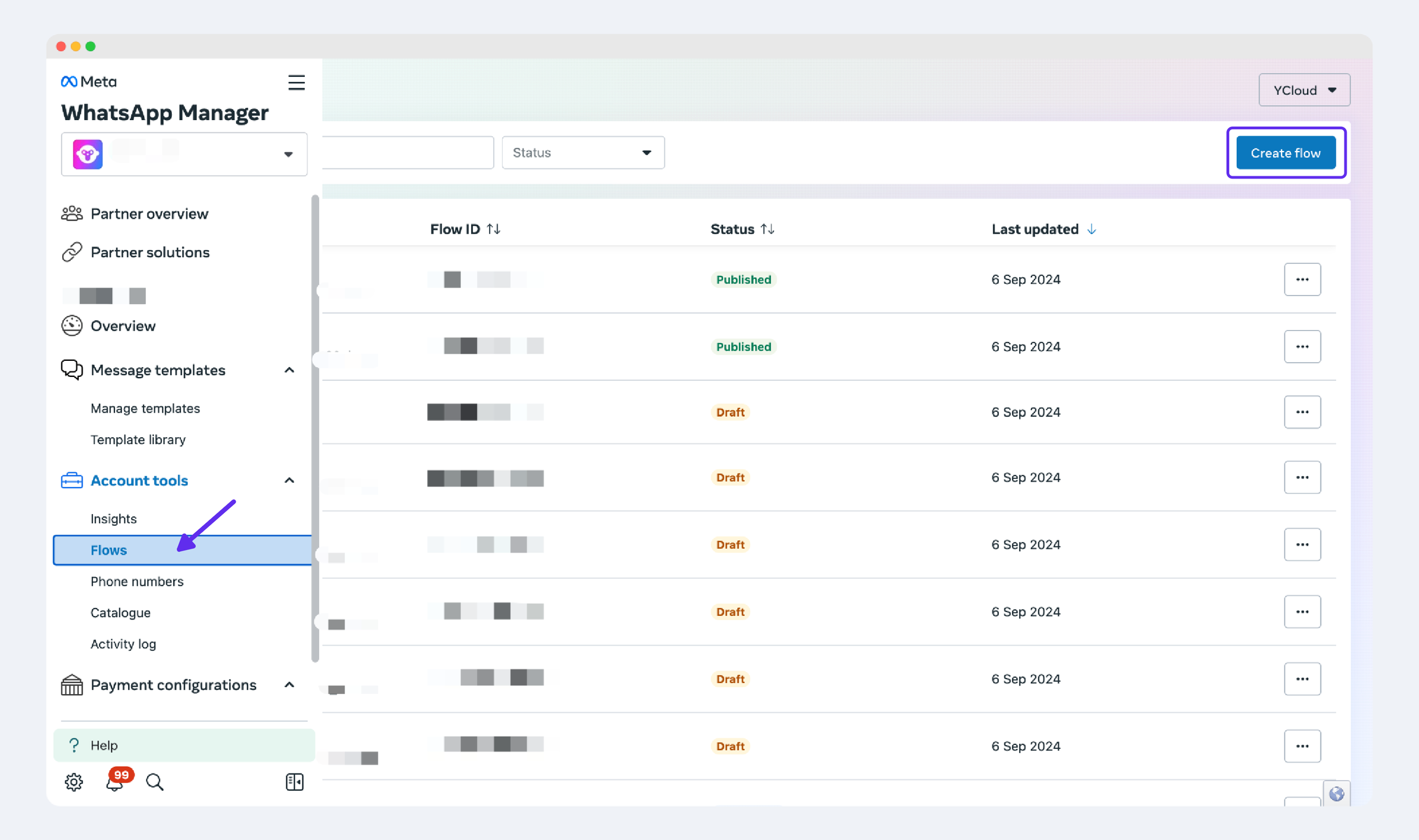 YCloud currently does not support creating WhatsApp Flows in the YCloud backend. You will need to create them in your own BM (Business Manager) backend. However, please note that only accounts with business verification can create Flows.