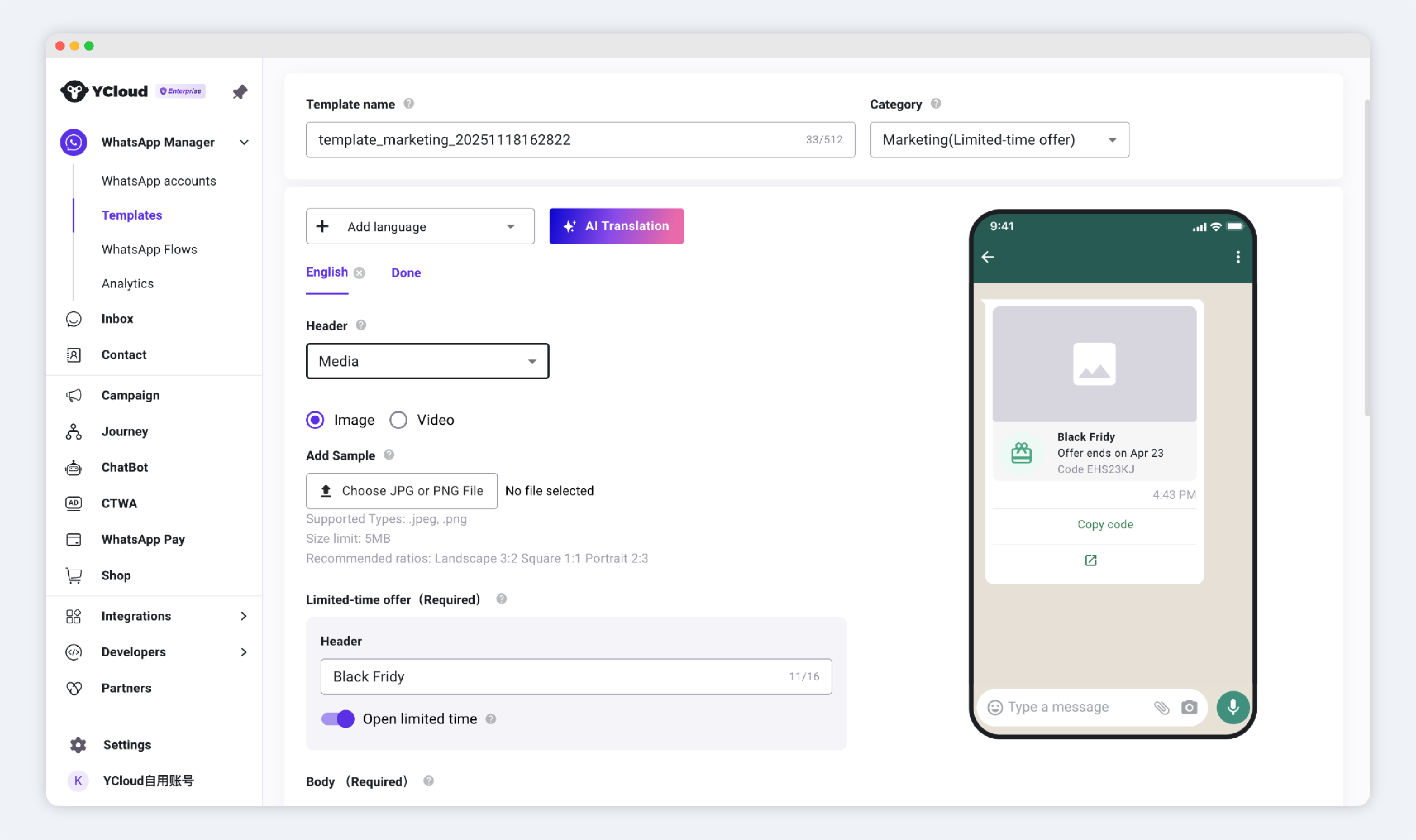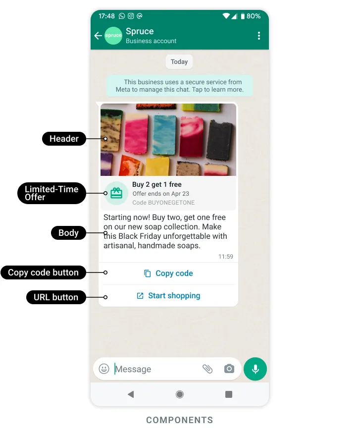 Limited-time offer templates allow you to display the expiration date of a discount code and a running countdown timer in your template message, making it easy to communicate limited-time offers and drive customer engagement. Limited-time offer templates are only available for marketing template messages.