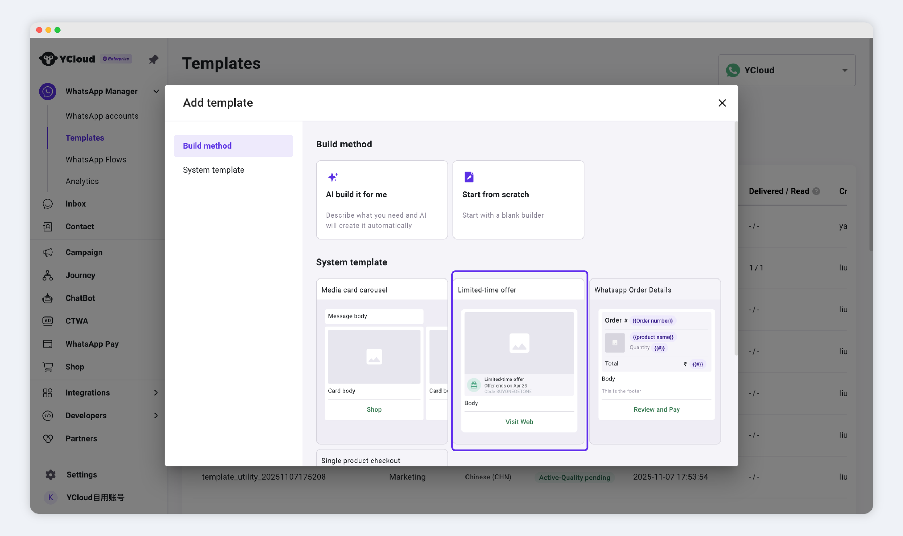 2. [WhatsApp Campaign](https://helpdocs.ycloud.com/help-center/campaign/create-a-whatsapp-marketing-campaign)