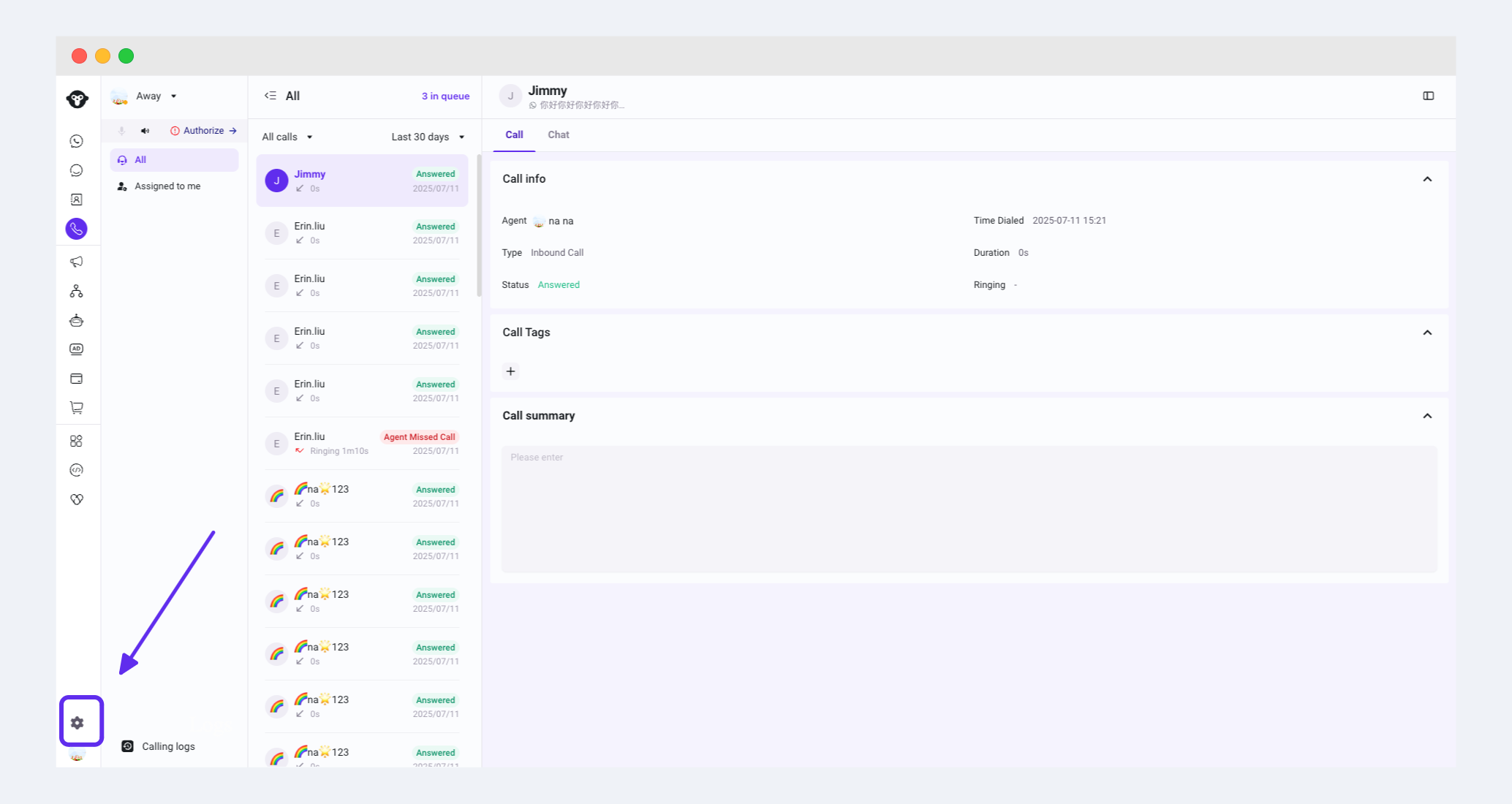 通过 Calling 界面左下角的 Calling logs 进入查看历史通话数据,可以通过上方的筛选按钮对通话记录进行筛选,点击具体的某一条通话记录可查看通话详情