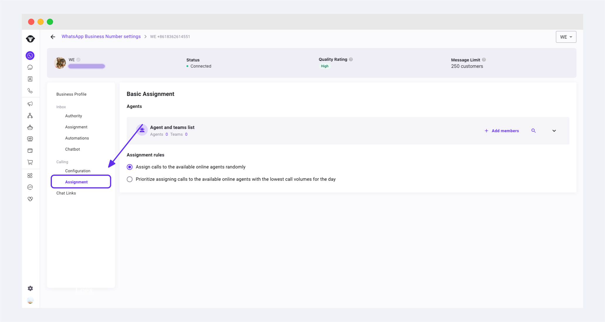 进入 Calling 的分配规则设置页面。添加对应的团队或具体成员到列表中。通过添加、删除、搜索,进一步管理查看列表人员