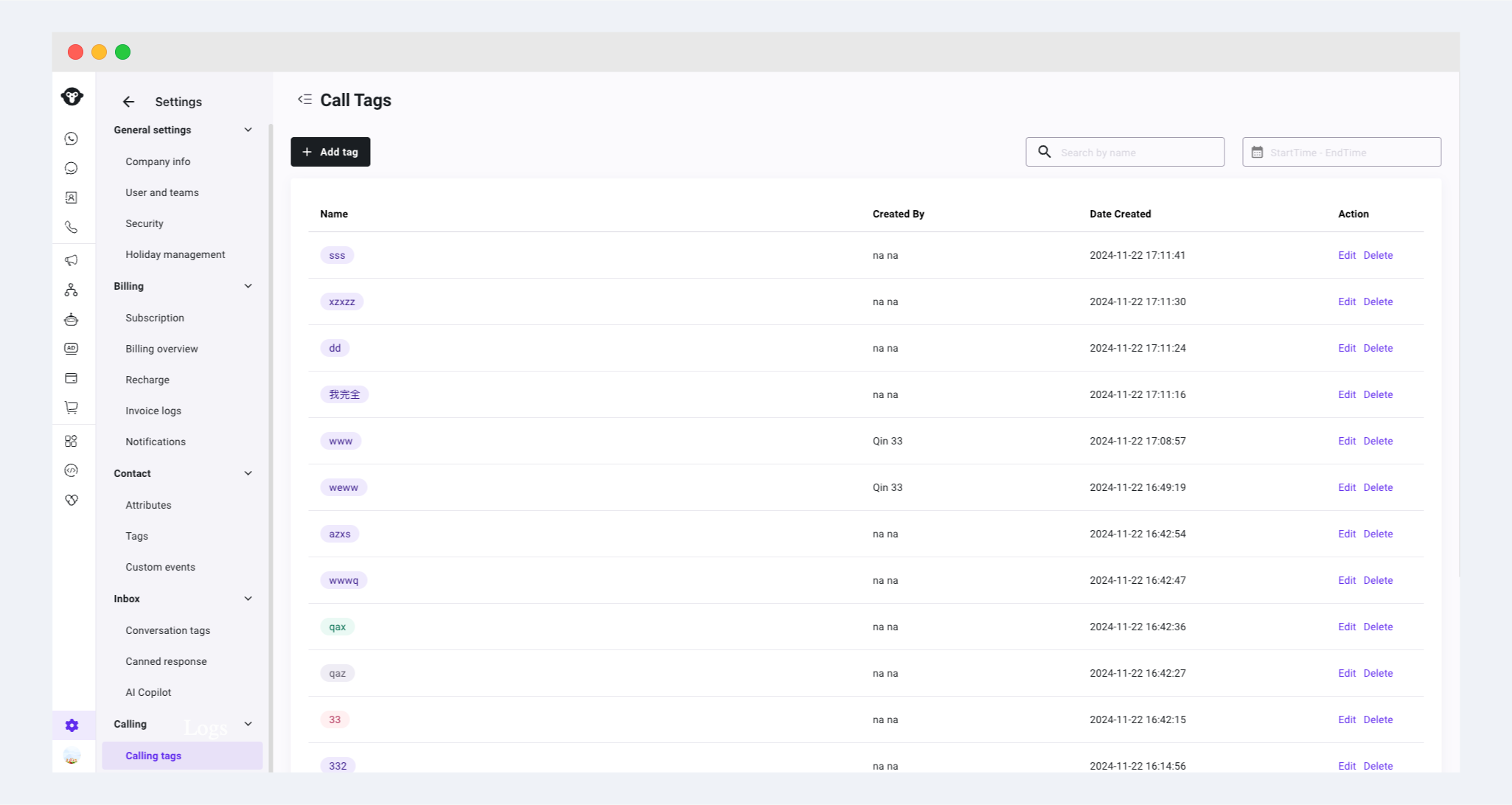 主管人员可以通过左下角 Setting 按钮,进入子菜单 Calling 中的通话标签界面,对通话标签进行增删改查操作
