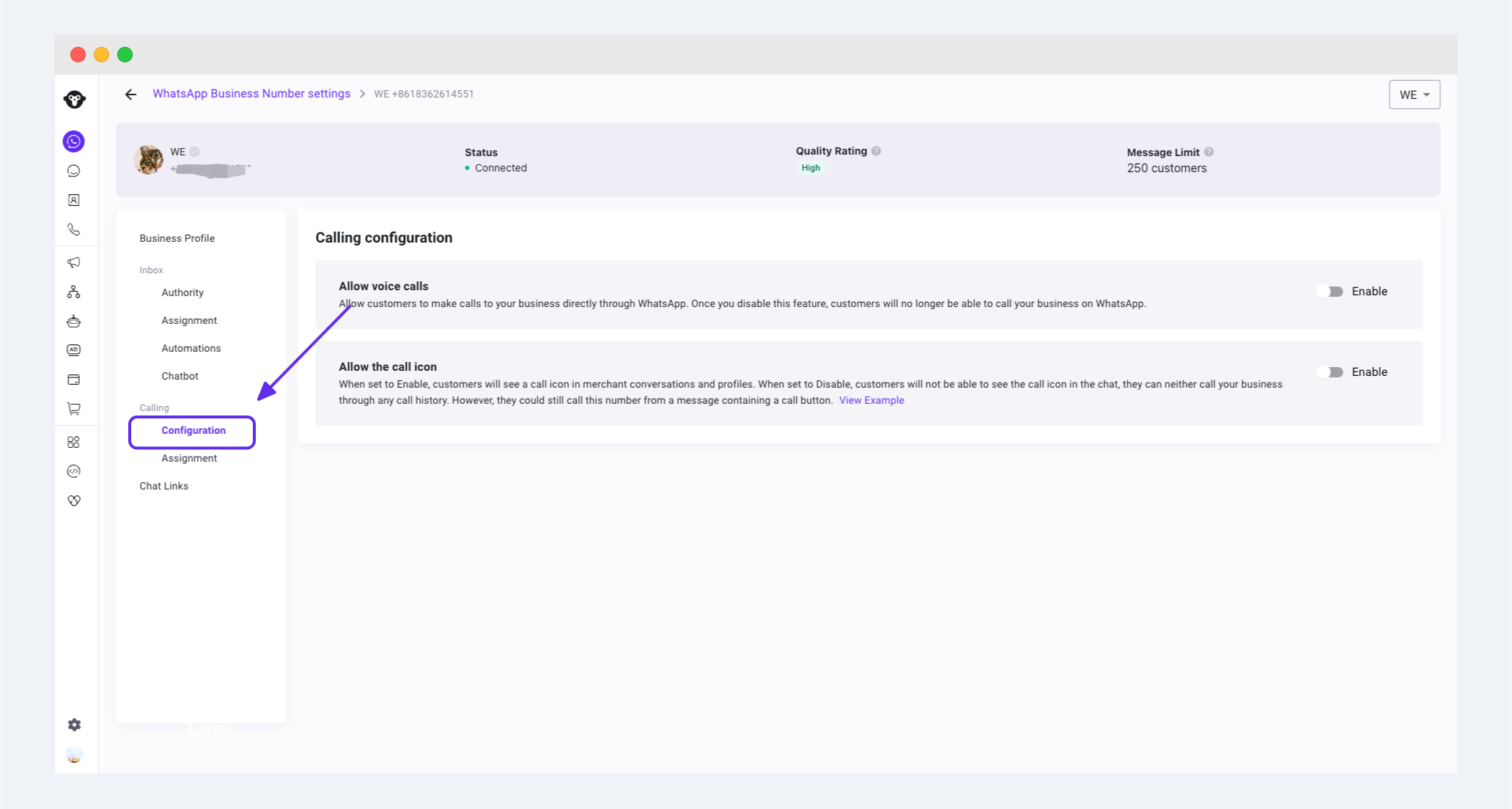 允许语音通话:开启后,您的客户可以在 WhatsApp 上向您的商业号码发起通话。如果关闭该开关,则任何用户都无法在 WhatsApp 上向您发起通话