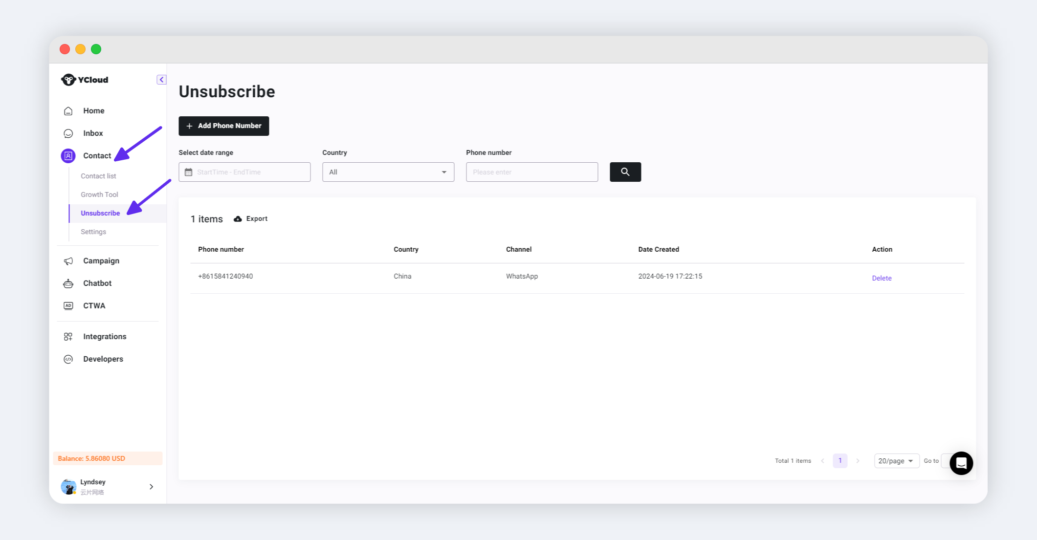 登录[YCloud账号](https://www.ycloud.com/console/#/entry/login)，导航至Contact > Unsubscribe 页面