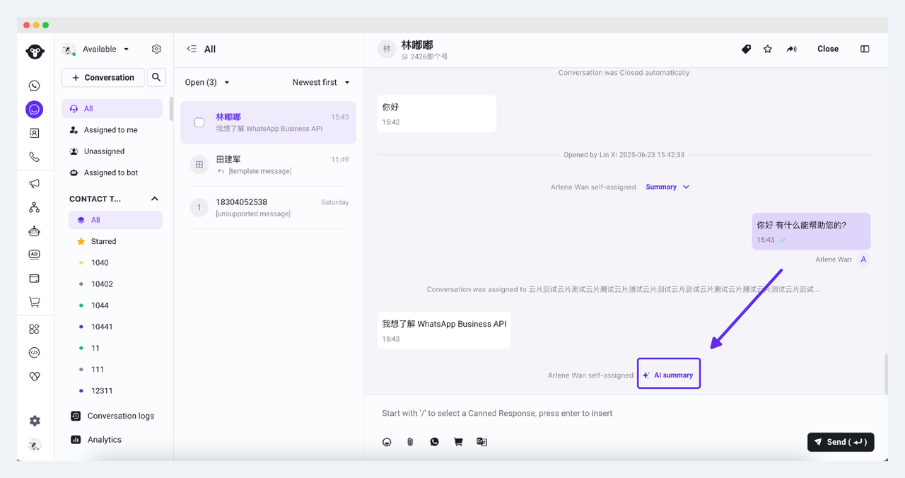 会话结束时，手动点击需要进行摘要的会话内的【AI summary】按钮触发 AI 摘要。