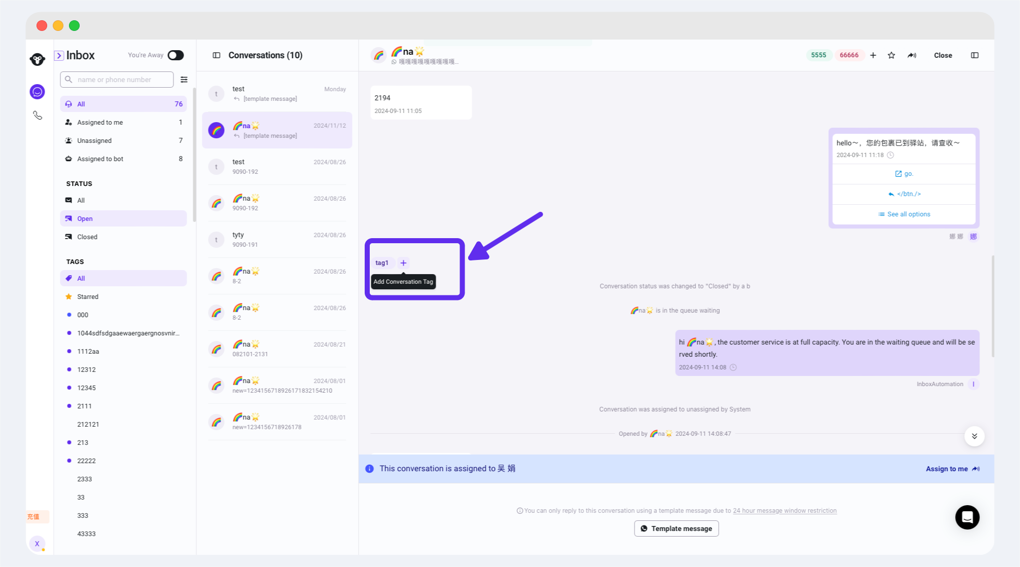 您可以通过点击会话展示区域上方的添加按钮对会话添加标签。