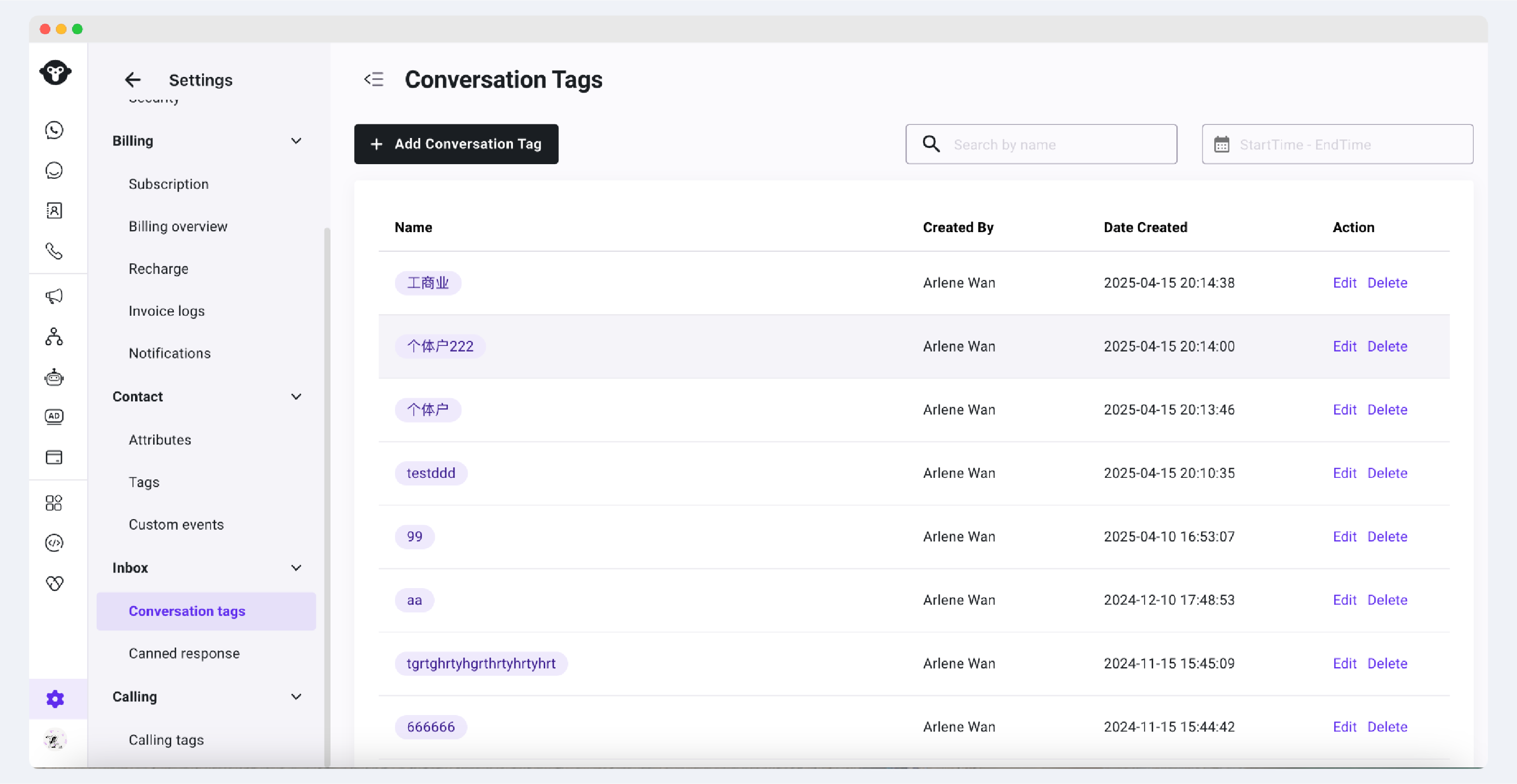 4. 点击删除按钮可以删除对应的标签，注意删除后会话内已经打标的标签也将一并删除，请谨慎操作。