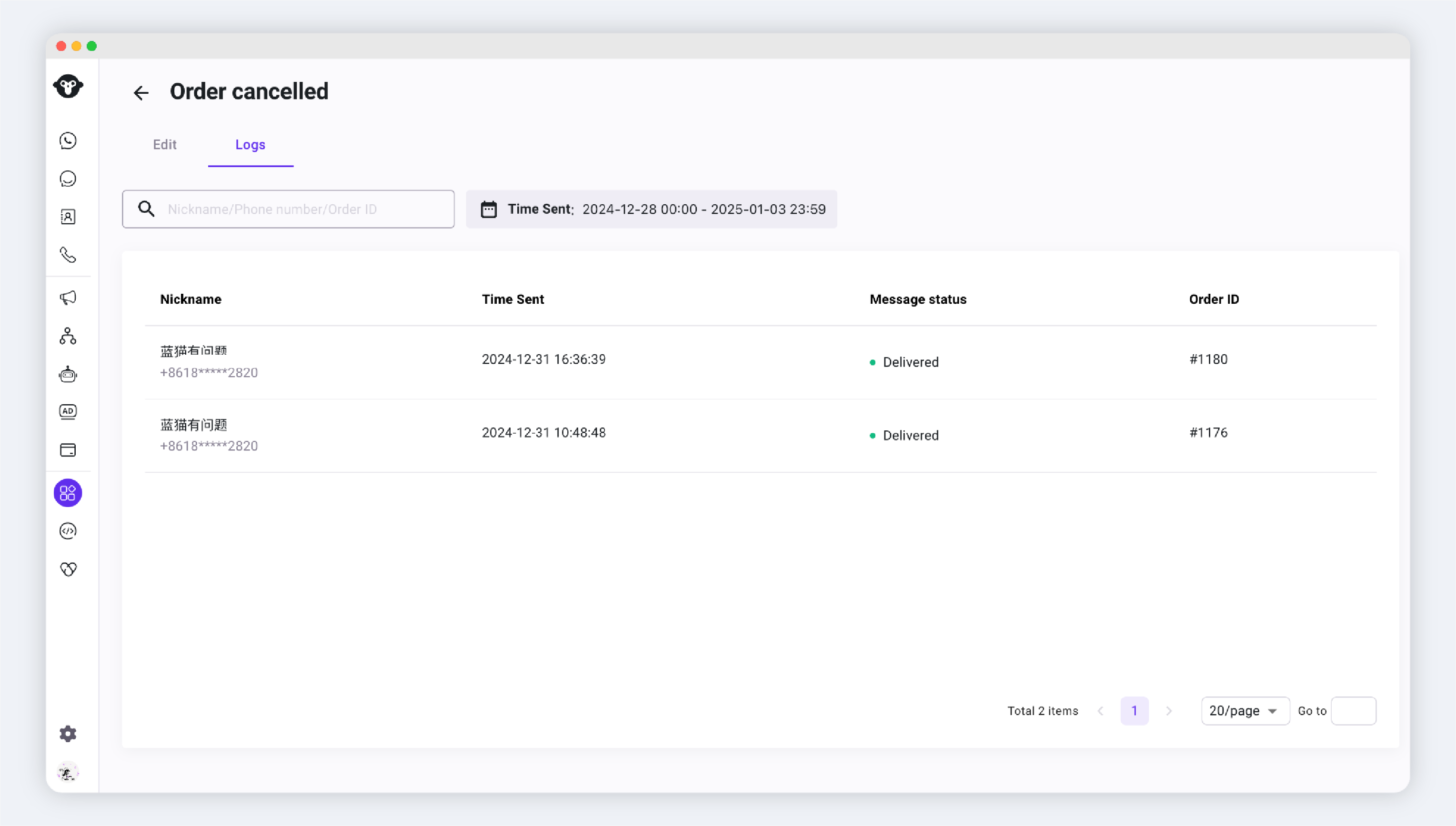 当订单状态变更为**取消/已履约**时，通过WhatsApp的消息自动提醒客户。