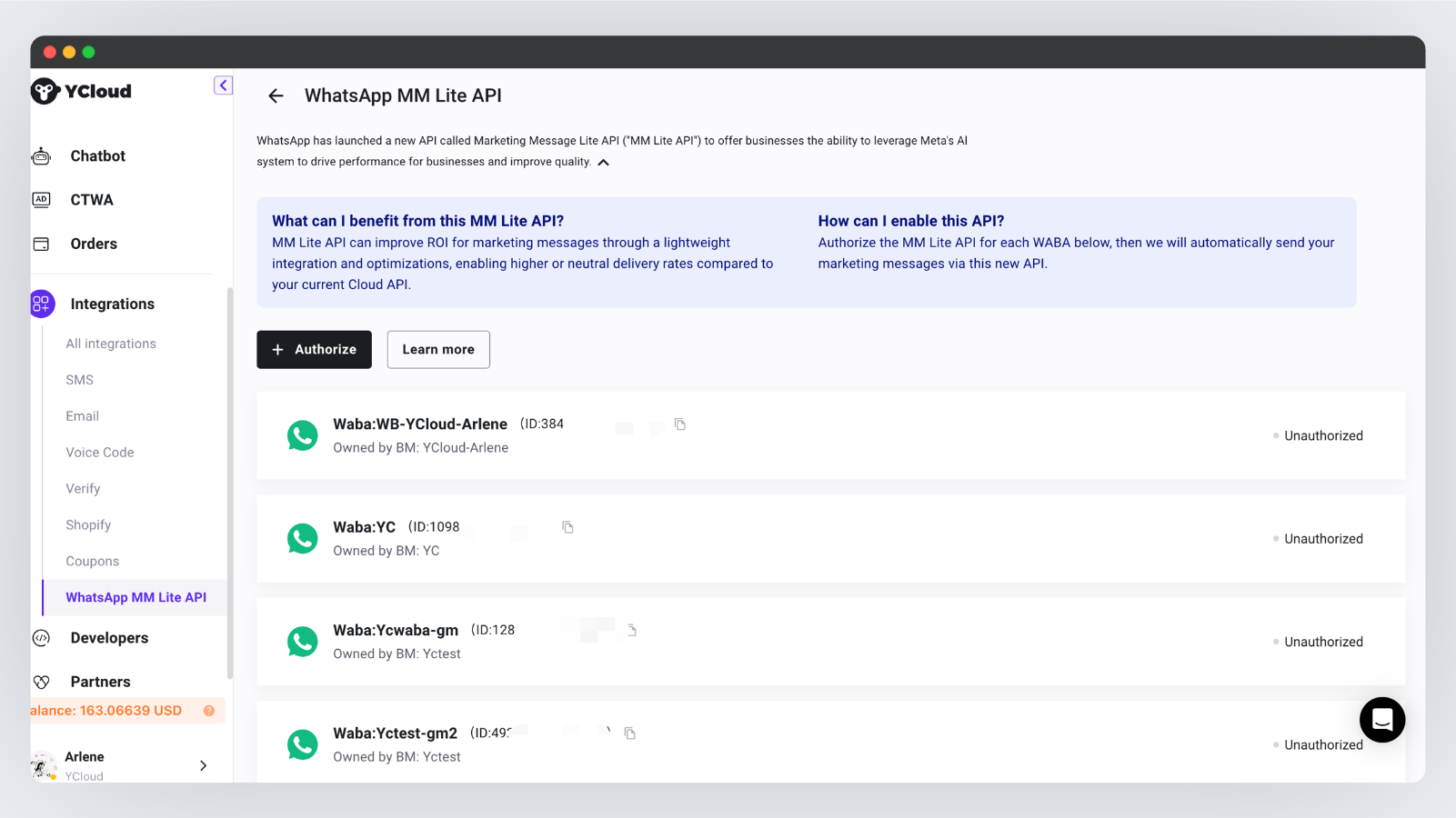 访问 [MM Lite API 授权页面](https://www.ycloud.com/console/#/app/integrations/mmLiteApi)， 点击 **授权** 按钮。在弹窗中选需要授权的WABA，并完成授权流程。