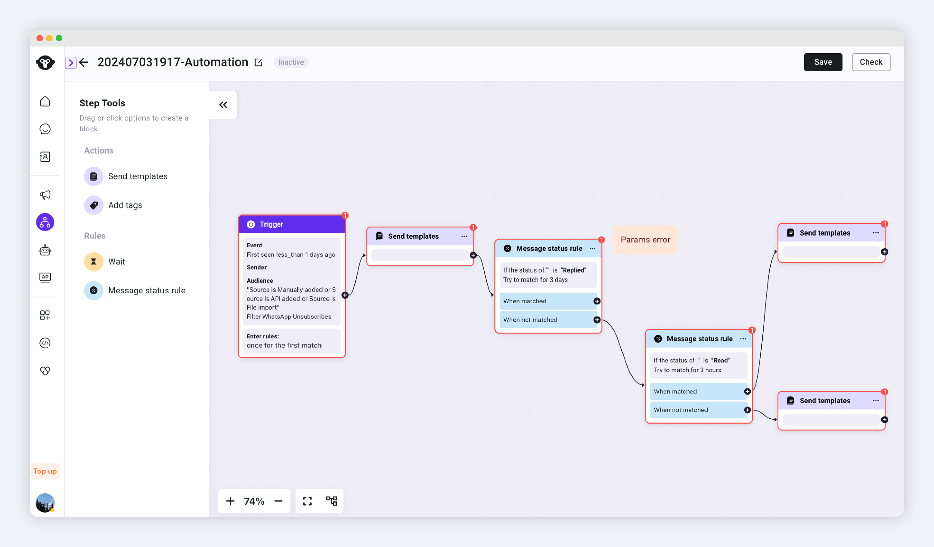 若保存时组件设置有误，可查看红框组件右上角的错误提示，修改后点击右上角检查按钮进行检查。