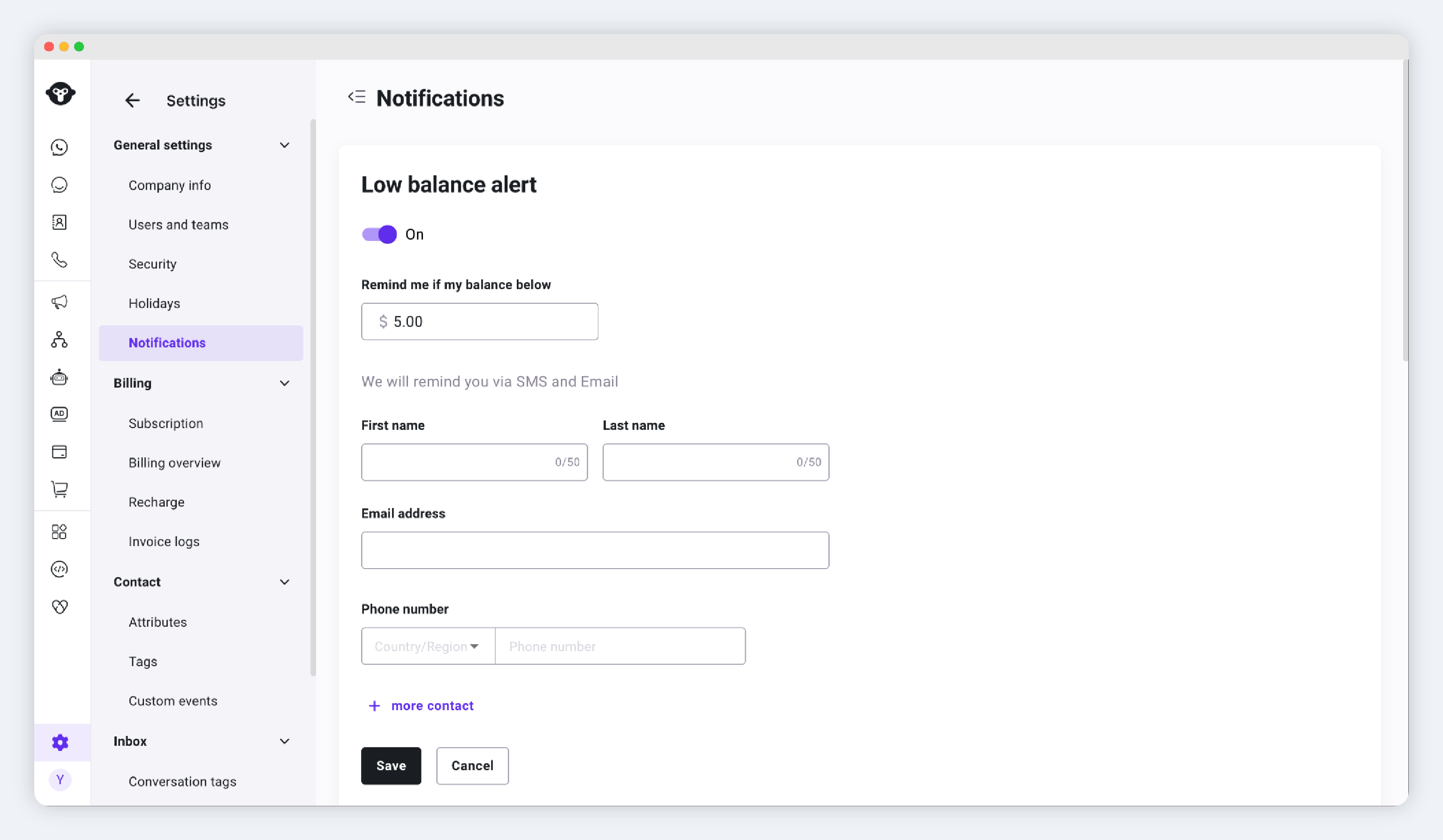 配置入口：Settings > General setting > [Notifications](https://www.ycloud.com/console/#/app/globalSettings/general/notification)