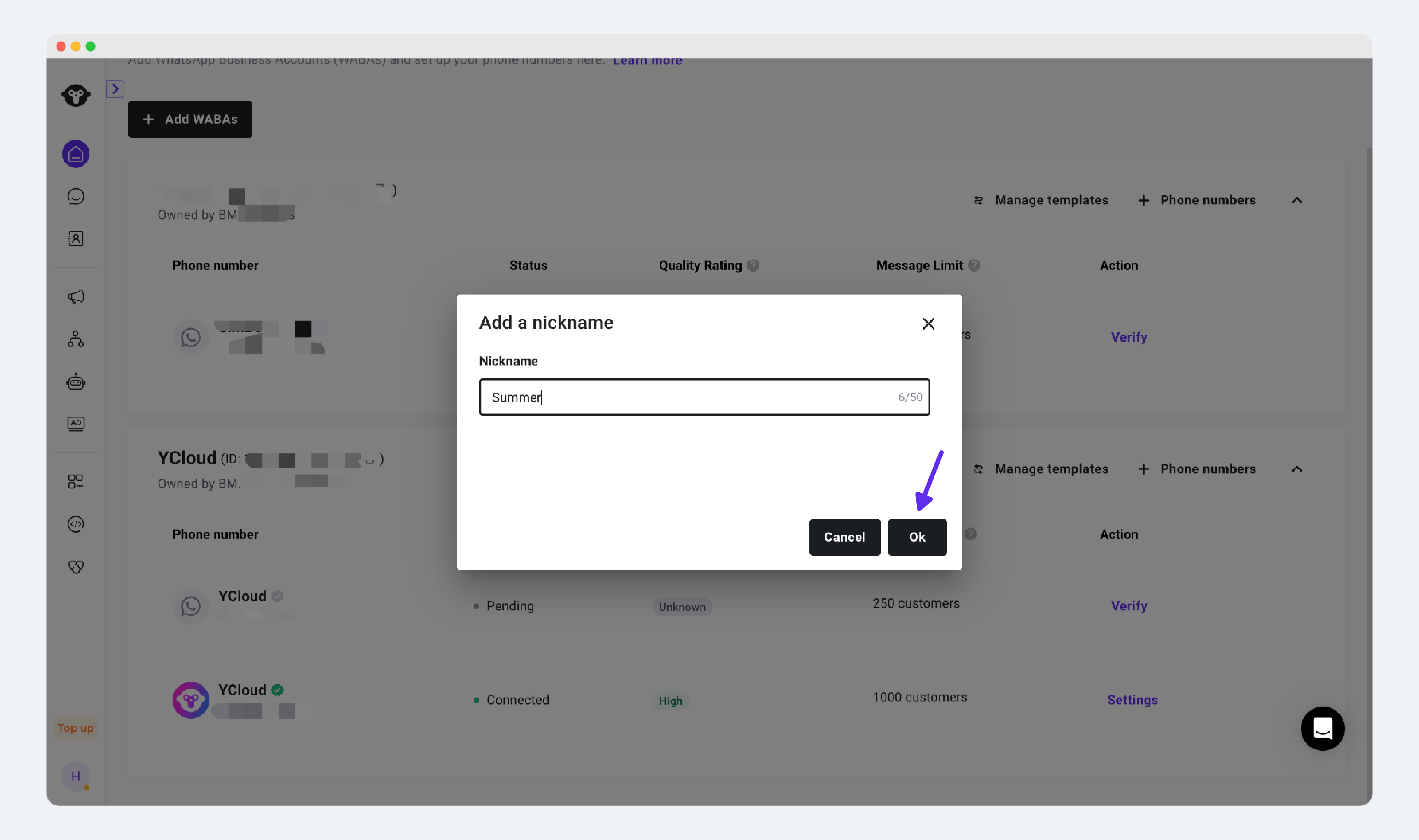 1. 登陆YCloud后台，WhatsApp Account > Phone numeber > 点击账号名称旁边的紫色图标