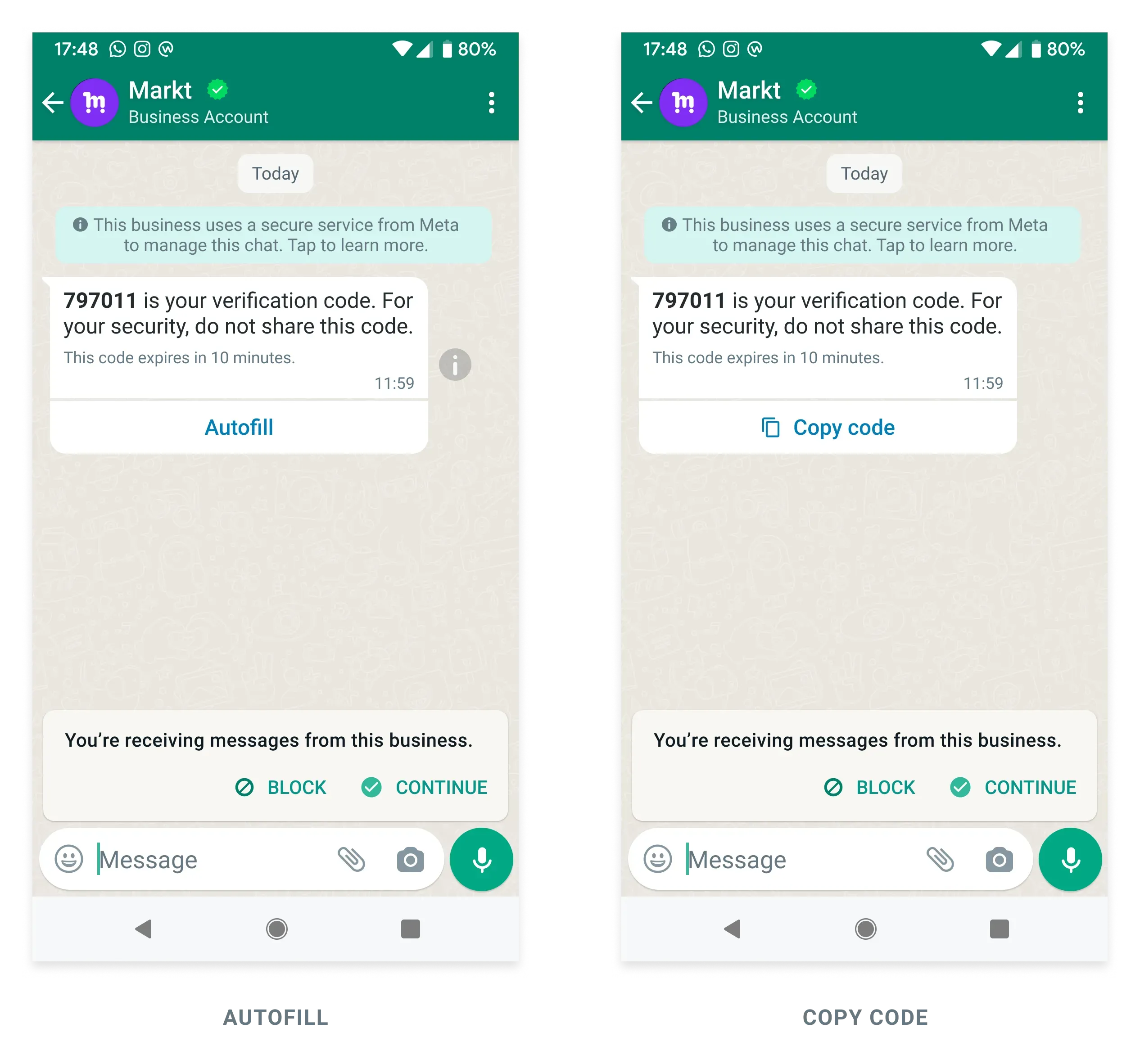 当 WhatsApp 用户点击复制代码按钮时,WhatsApp 客户端会将密码或代码复制到设备的剪贴板。然后,用户可以切换到您的应用并将密码或代码粘贴到您的应用中。