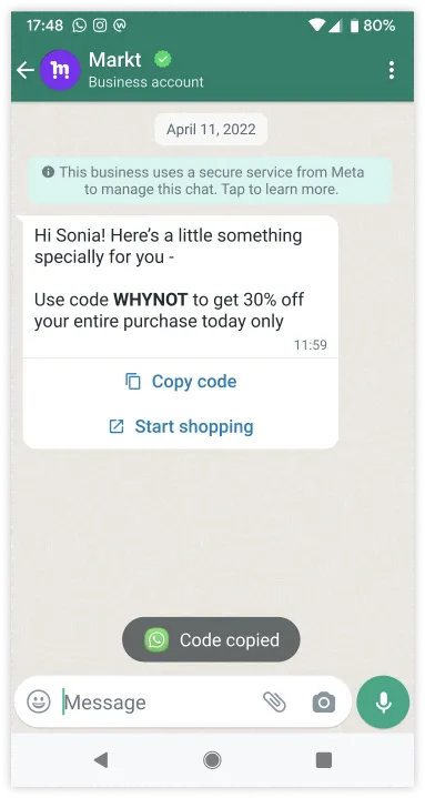 * WhatsApp web客户端目前不支持优惠券代码模板。