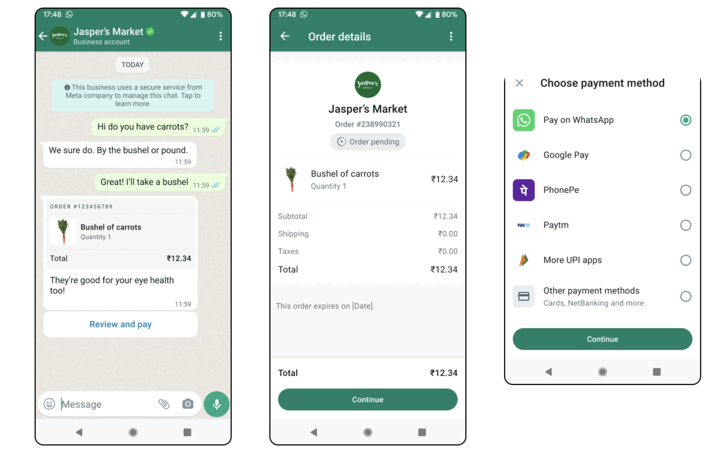WhatsApp pay 能够帮助商家在WhatsApp app中对客户进行收款，以此可以实现订单催付，购物车弃购等场景。
